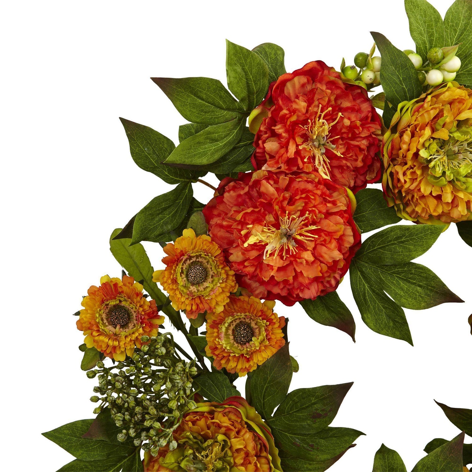 Brilliant shades of orange and yellow Peony and Mums bundle together in this summer sunset of a wreath. Delicate Peony buds and lush, green foliage are intertwined with handcrafted materials to form this 24" wreath. Hang at the entryway to greet guests with a burst of color, or place atop the mantel with candles and books for a summertime sunset vignette display.