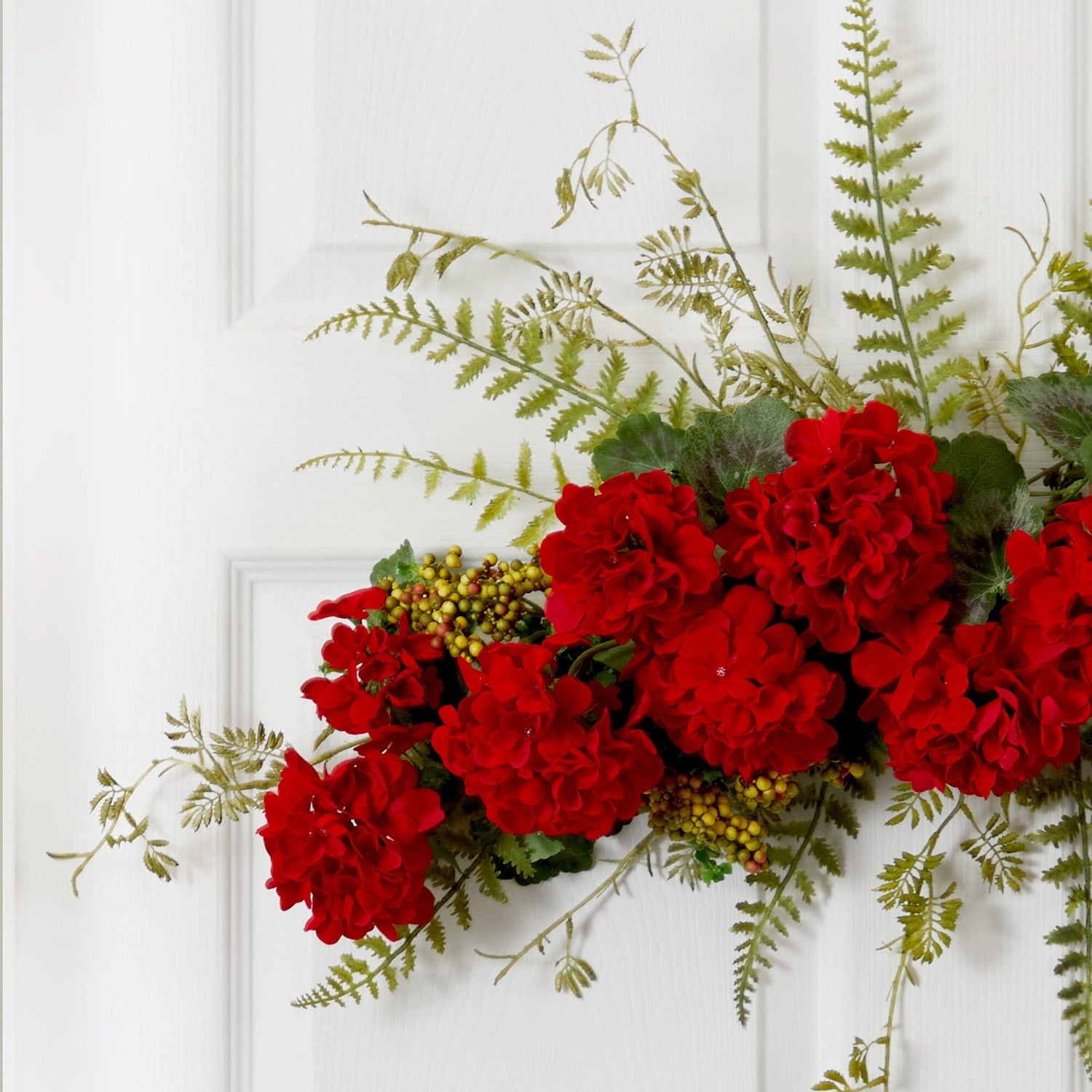 Dainty berries mixed with vibrant red geraniums creates a colorful home decor display. The blooming geraniums burst intermixed with a variety of green leaves for a textured and lifelike arrangement. Place on a mantel or display on a shelf for festive display.