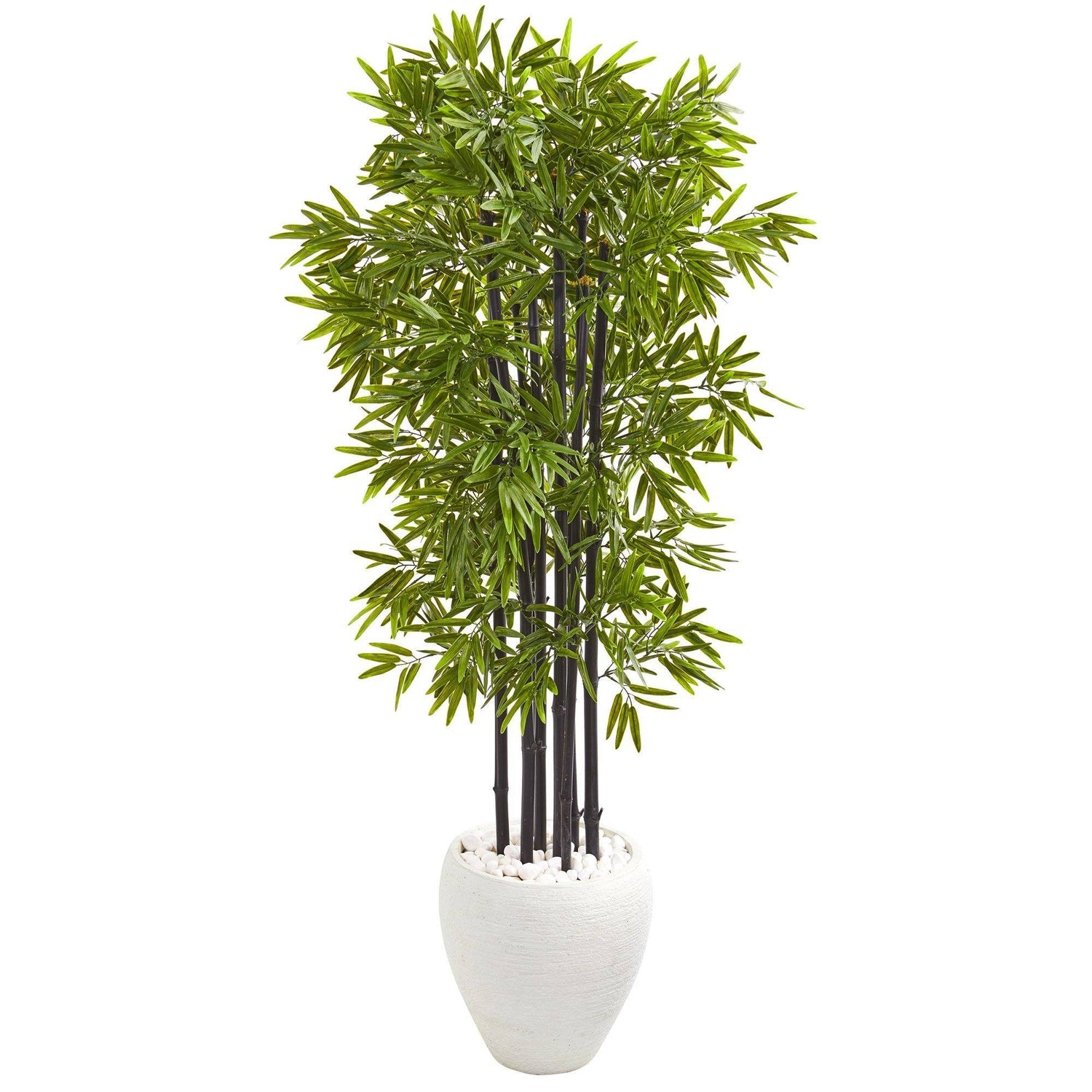 Design a natural sense of forestry with this artificial outdoor-safe bamboo tree. Showcasing a collection of brightly colored leaves stemming from realistic black trunks, this 5’ tall tree comes in a white planter accented with white rocks. Impressive in size, it can easily spruce up a bare balcony or an outdoor patio without wilt or discoloration.