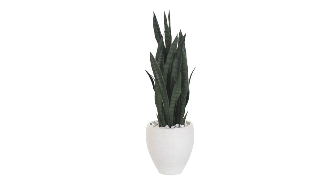Dense leaves grow tall in this artificial replica of the Sansevieria plant. Standing 51” high, this dignified succulent shows off amazing lifelike qualities; from authentic coloration to dark, pointed leaves. Nestled among natural-toned rocks in a white textured planter, it adds an instant touch of nature’s beauty within the home.