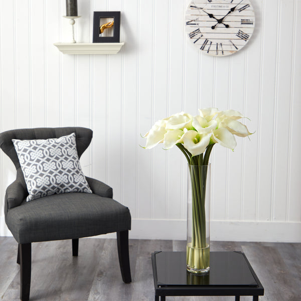 “Ooooh… nice.” That’s what we thought when we stepped back after creating this large Calla Lilly, and it’s what your guests will say when they gaze upon it. With several fresh-looking stalks rising in a tall cylinder vase (complete w/ faux water) giving way to the gaping white blooms above, this is an arrangement that permeates a peaceful, tranquil feeling. And because it never needs water and care, those feelings will last a lifetime!