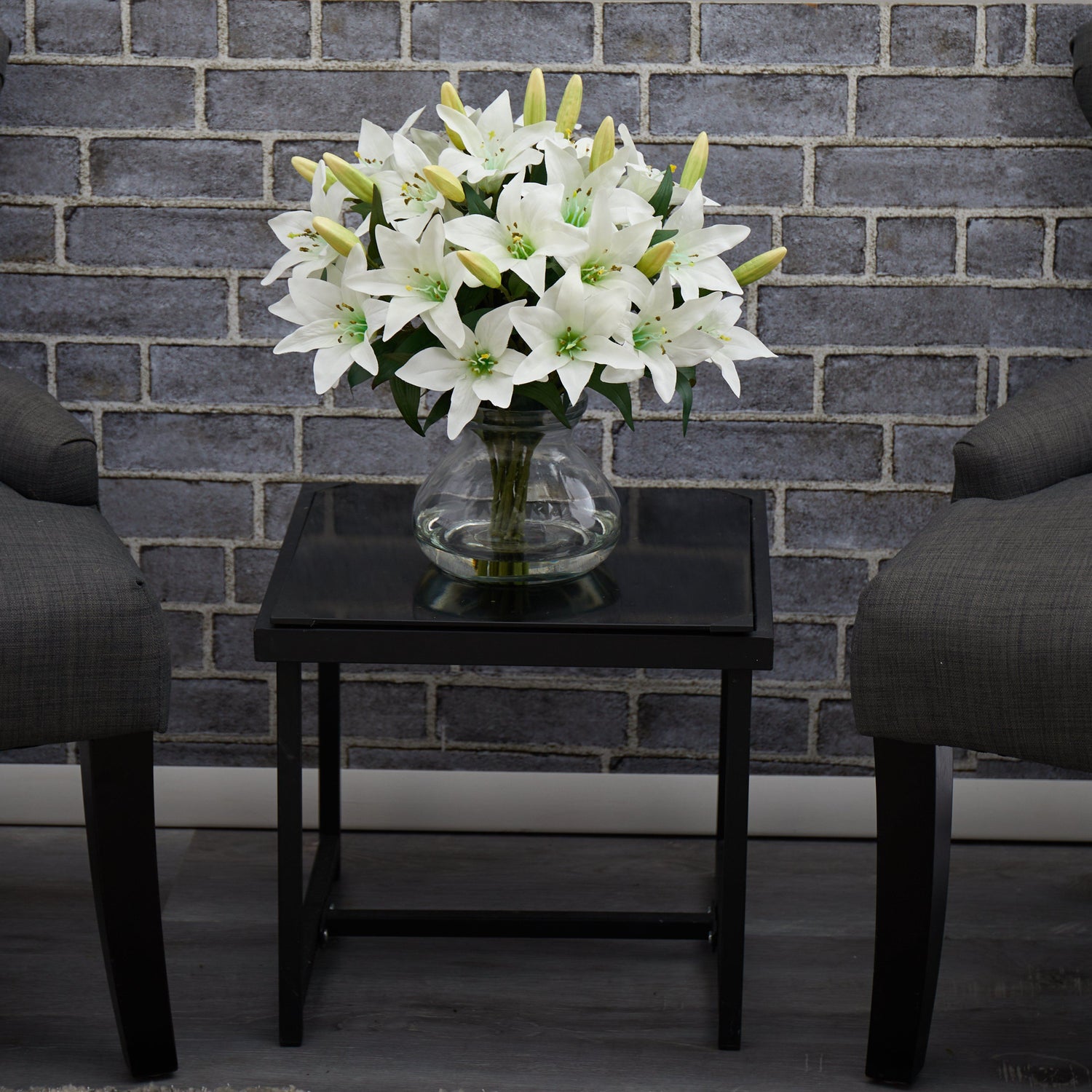 This mix of white lily blossoms and buds will grace any tabletop. The blooming lilies that encircle the bottom make a realistic statement. Buds crown the top of this luscious arrangement. Comes in a clear, curved vase to show off the faux water and twisted stems.