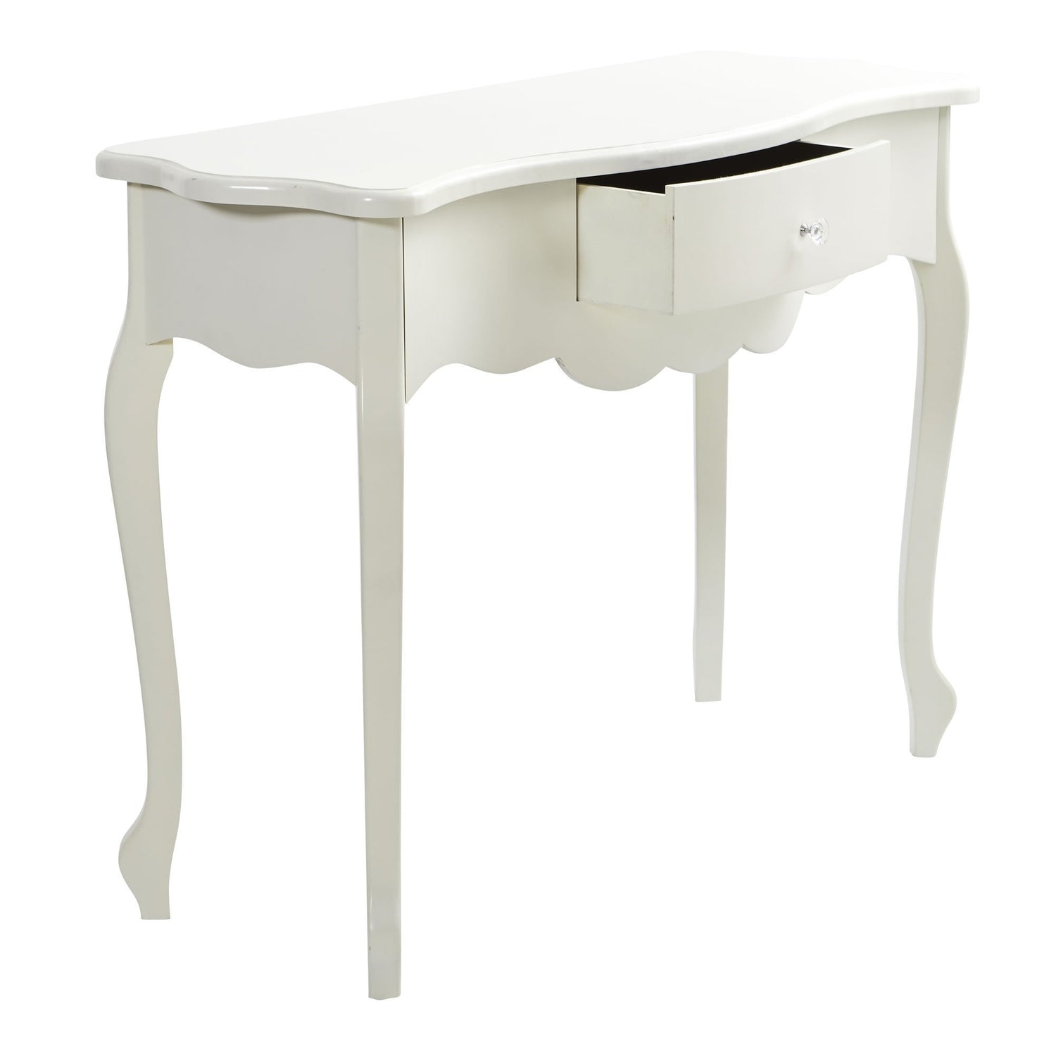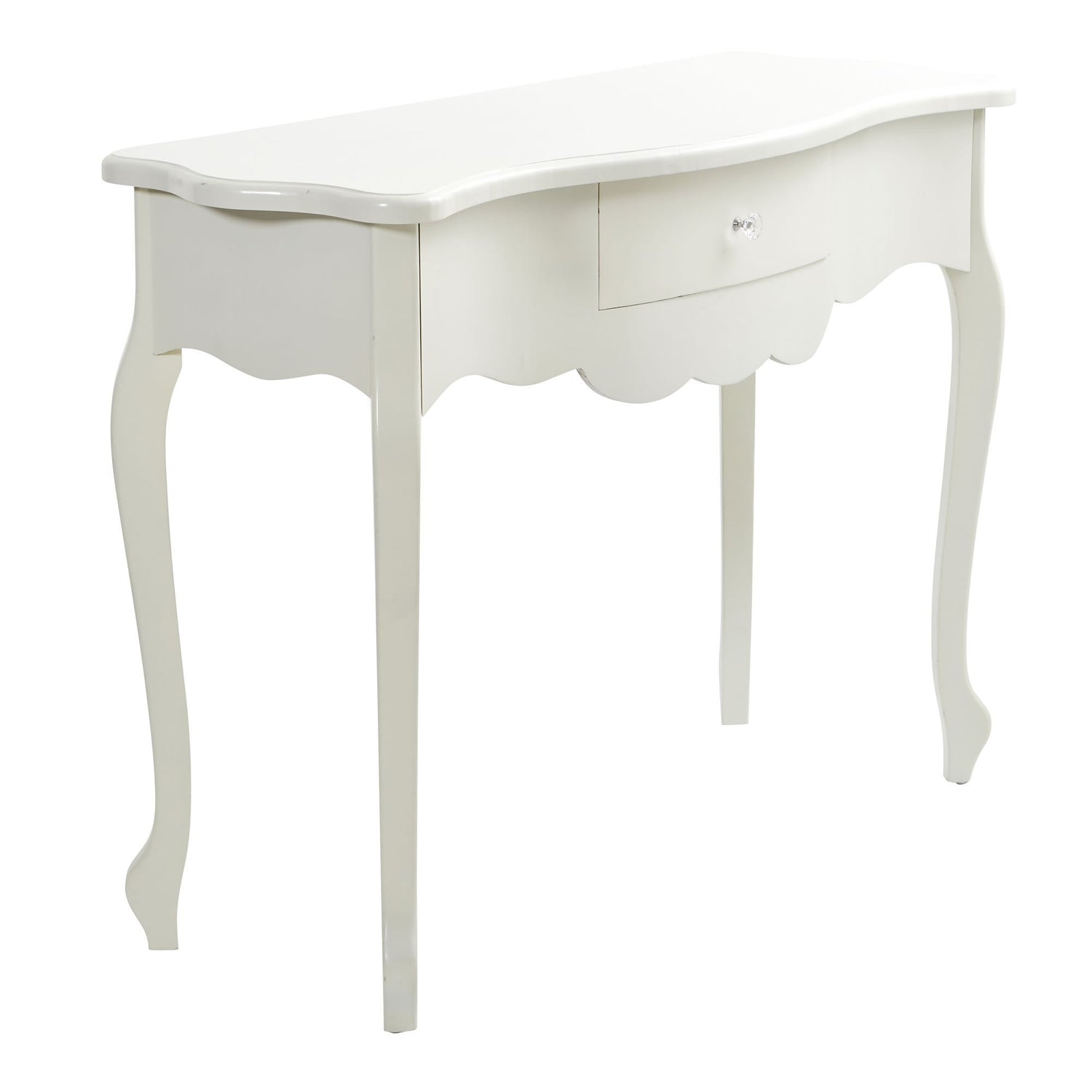 This 45.5 inch white vintage desk is elegant and minimal, with a single drawer built into the center. The pure white table can be paired with minimalist-inspired decor and look elegant in more classically-styled homes. Put it in your living room behind your sofa or in your entryway with a boldly hued faux plant for an eye-catching look. Basic assembly required.