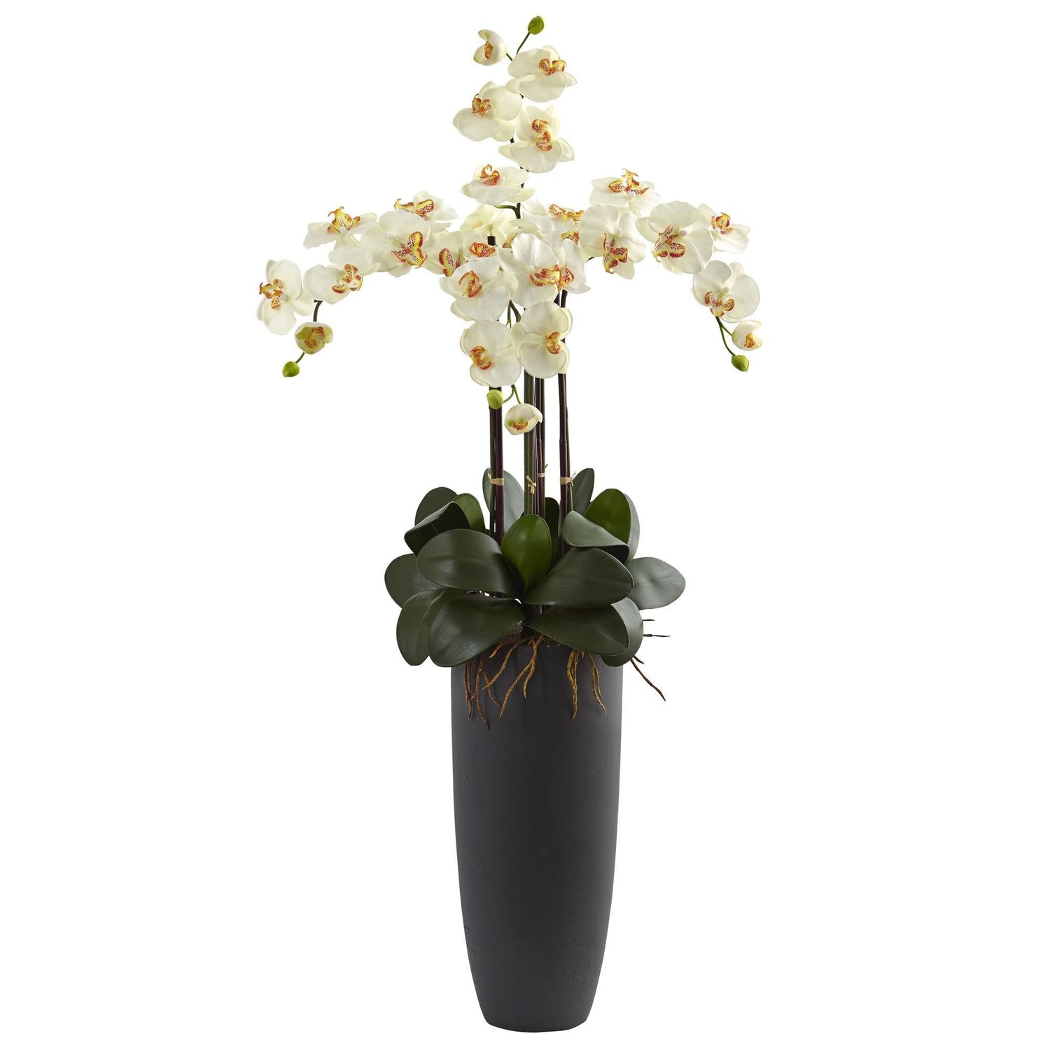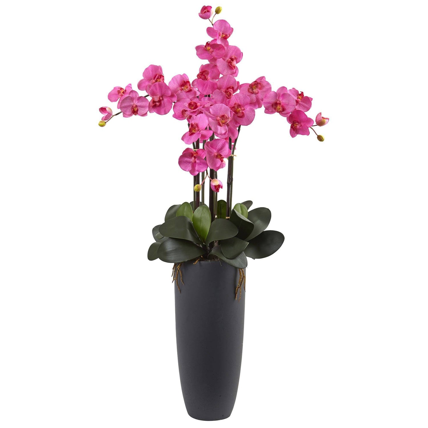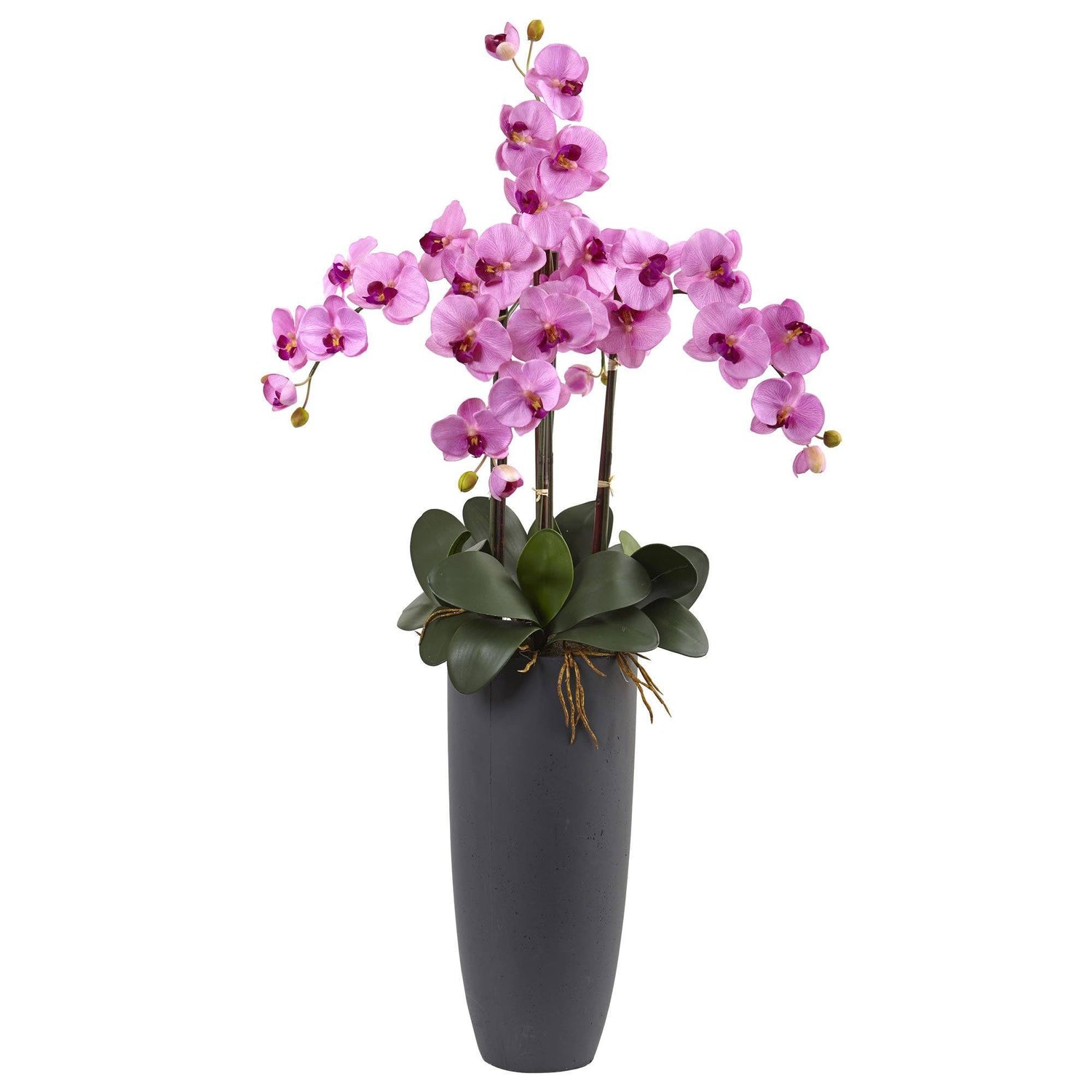The delicate petals of this orchid cascade down into a circle of smooth leaves and moss. Four stems branch out vertically and horizontally with little buds dangling from the ends. Showcased in a matte gray bullet vase to complement contemporary and modern home decor.