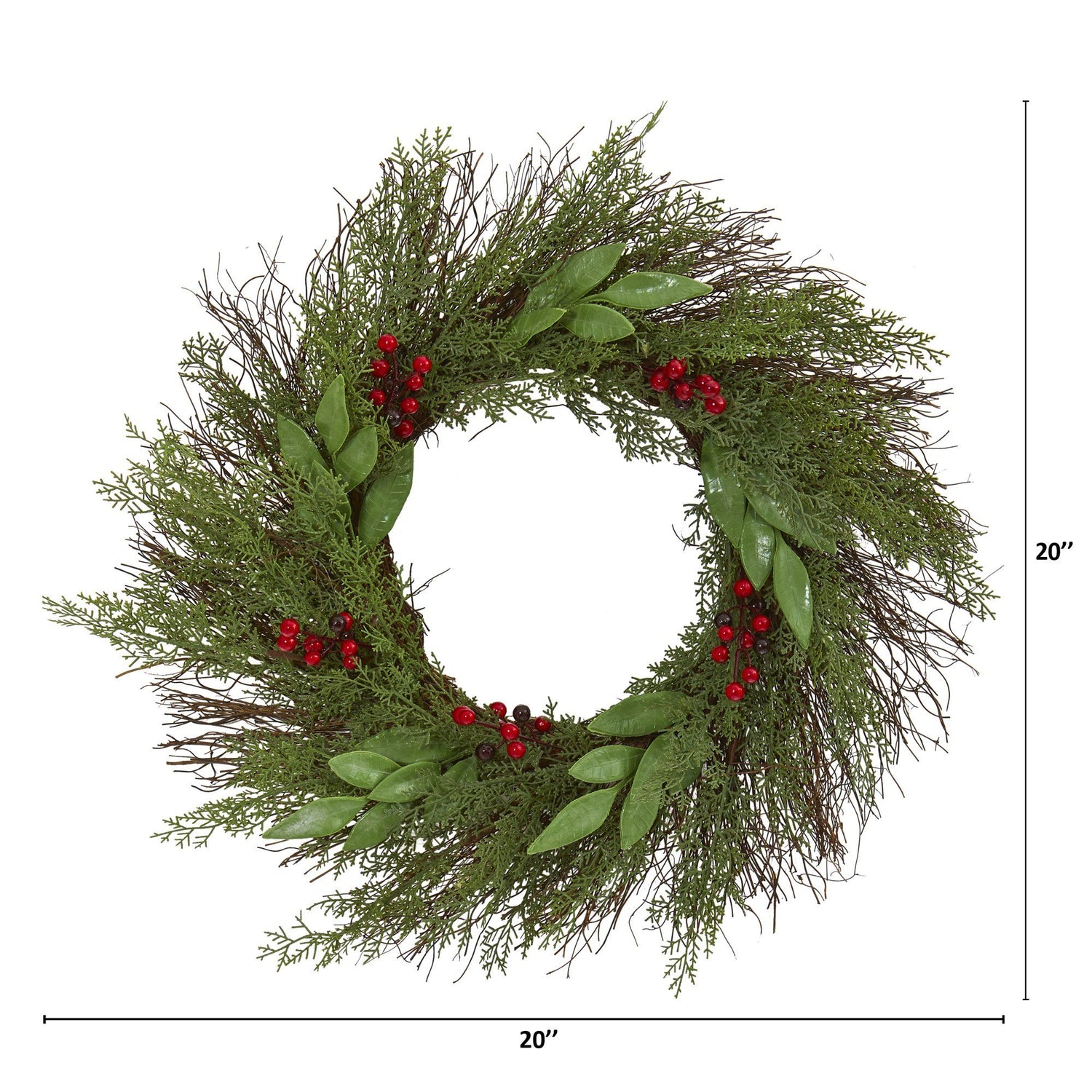 Spruce up the entrances to your home or office with this seasonal-inspired artificial wreath consisting of realistic-looking cedar and ruscus foliage in a palette of year-round greens, handsomely accented throughout with bright red holly berries. Measuring 20” around, this silk wreath would make a fine holiday gift.