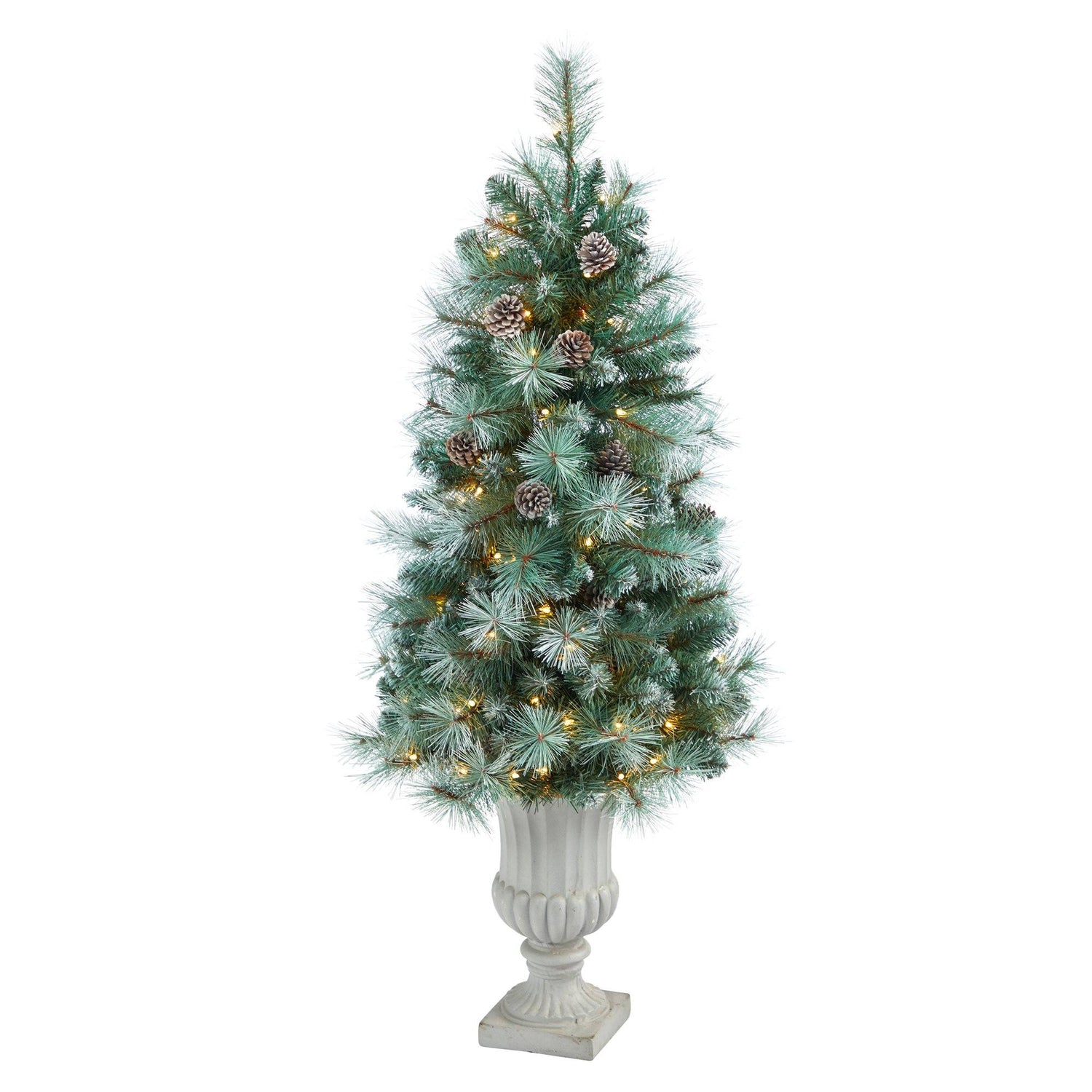 Bring the Canadian forest's rustic charm with the help of this Frosted Tip British Columbia Mountain Pine Artificial Tree. A nod to nature, this realistic lifelike tree is accented with faux pinecones throughout and has the appearance of fresh, soft snow on the tips. The 228 easy-to-bend branches allow you to shape and fluff as you like while the 100 clear lights create a warm, candlelight glow – saving you time and money. Standing at 4.5' from a decorative urn (included in height), let it snow in compact spaces.
