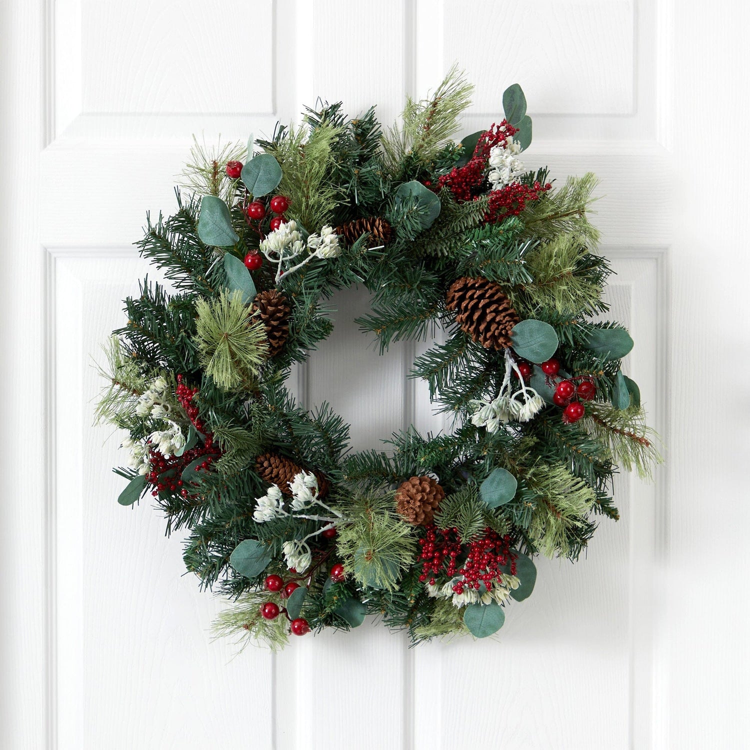 Keep winter-inspired decor accents traditional this year with the help of this artificial wreath. Intricately designed from realistic looking pine foliage and other mixed greens, this decorative wreath comes carefully accented with a mix of red and white holly berries, handsomely complemented throughout with faux pinecones - all of which look incredibly realistic in order to get you into the holiday spirit. Perfect for wall and/or door display in either a home or office environment, this traditional 24” (in circumference) decorative wreath makes for an inviting accent and can undoubtedly help inject front-door appeal all throughout the season.