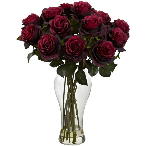 The rose is nature's classic flower. And this offering captures a bouquet of roses in full bloom, their lush petals invitingly open amidst a backdrop of greenery and straight stems. The included decorative vase even has liquid illusion faux water, completing the "rosy" picture. Perfect for both home and office decorating, this beautiful group of roses also makes an ideal gift.