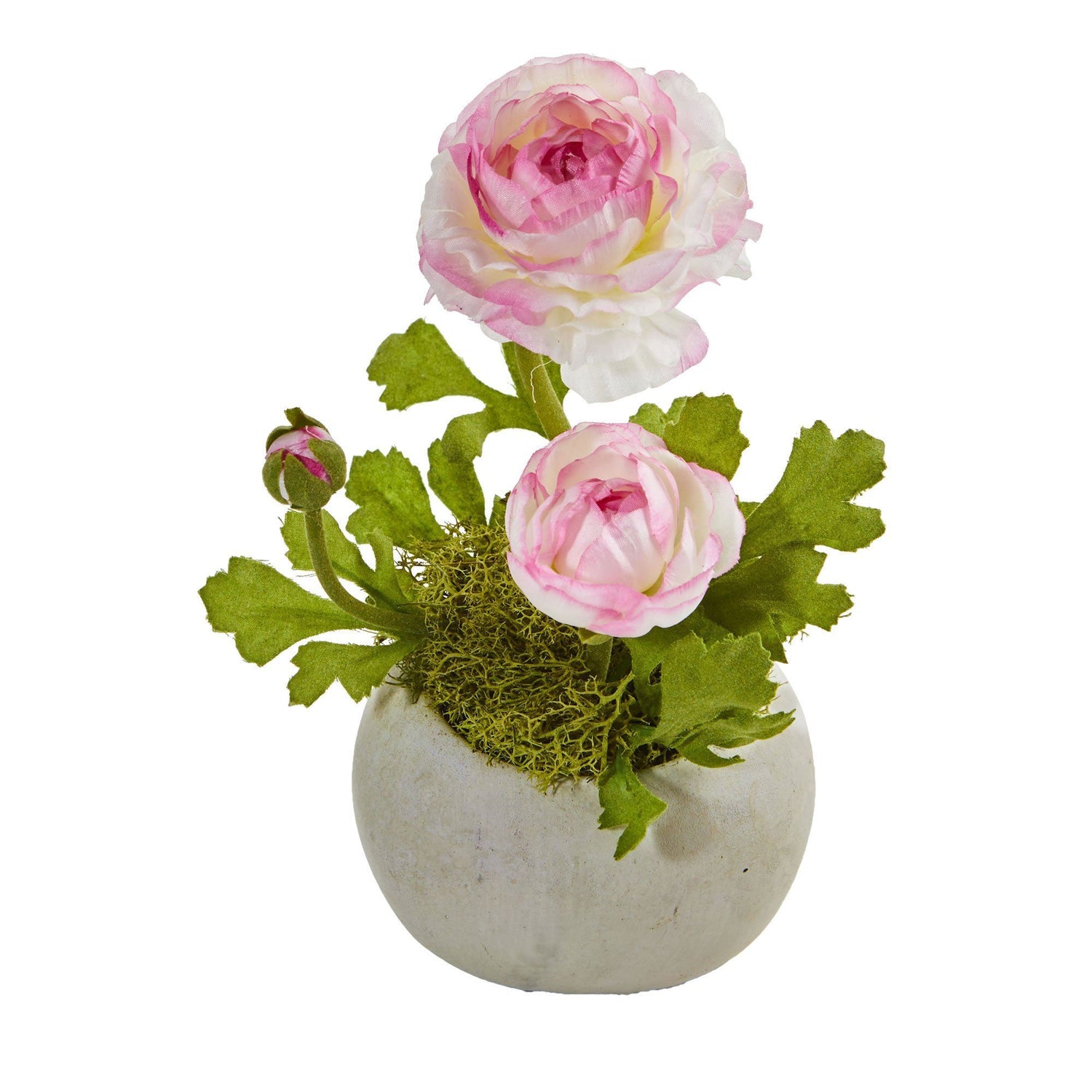Multiple layers of paper-thin petals make up the main attraction on this ranunculus artificial arrangement. With two flowers nestled into an angled designer vase with a bed of real moss, this set of two is perfect to place on either side of your kitchen sink for a bright pop of beauty. Or, place them in different rooms to create a feeling of cohesiveness throughout your home.