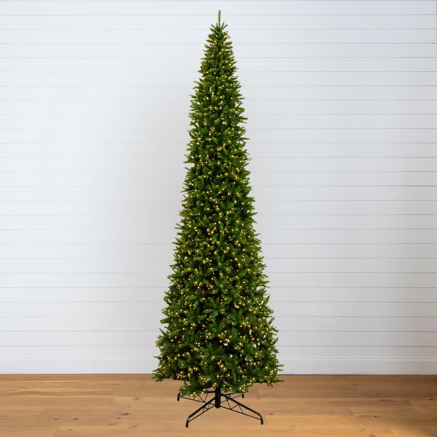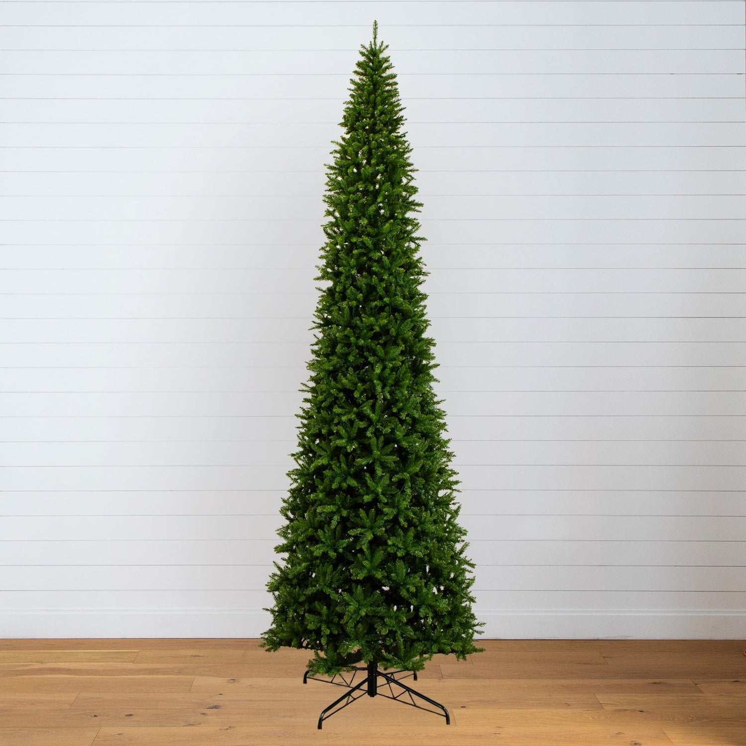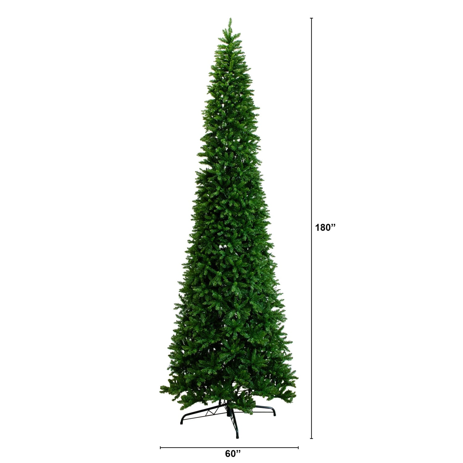 Incorporate seasonal evergreens into your decor scheme this holiday - no matter the size of your space - with the help of this artificial slim green Christmas tree. Entirely maintenance free, it features a slim, tight silhouette made up of mountain pine greenery with easy-to-bend branches for showcasing all your holiday ornaments and arrives pre-strung with 1900 energy-efficient Warm White LED lights to help eliminate the hassle of tangles or knots. As an added bonus, it also helps save on the energy consumption. Guaranteed to make holiday decorating stress-free, this slim-fitting artificial Christmas tree stands tall and proud at 15’, stabilized on a metal stand for effortless display all season long. If you have a tall ceiling, this tree was made for you. Great for a business, event, vacation home or rental.