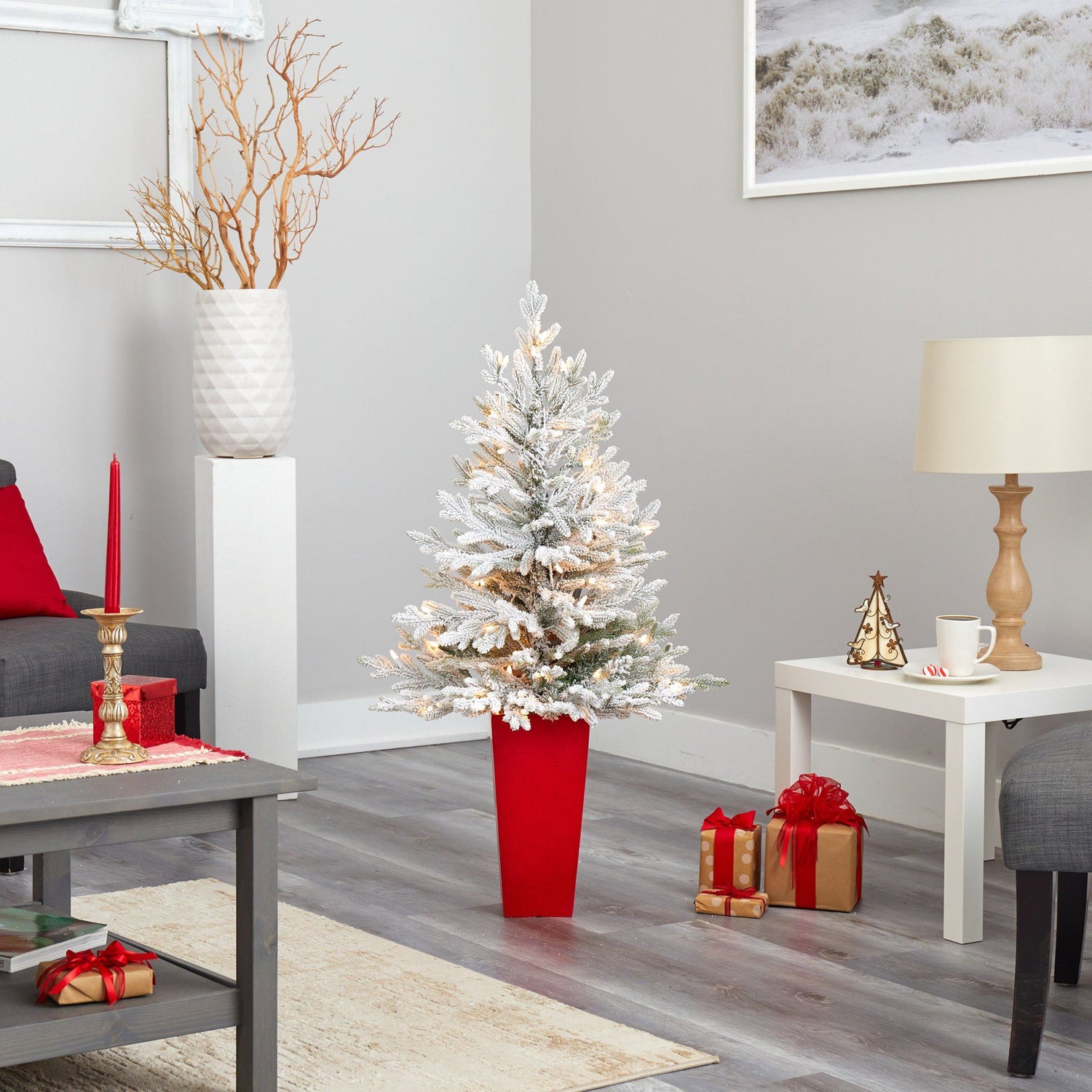 If you dream of a white Christmas, look no further; this flocked Fraser Fir Artificial Christmas Tree makes your wish come true with a realistic replica of winter. Designed to mimic a winter wonderland – 481 incredibly lifelike upward sloping easy-to-bend branches with the texture and foliage of a real tree – allow you to DIY in your space. Create a candle-like, warm glow with 200 warm, white pre-strung Xmas lights, saving you time and money. Standing at 4’ from a red planter (included in height), this artificial Christmas tree is perfect for compact spaces that need a powdery enchanting winter look.