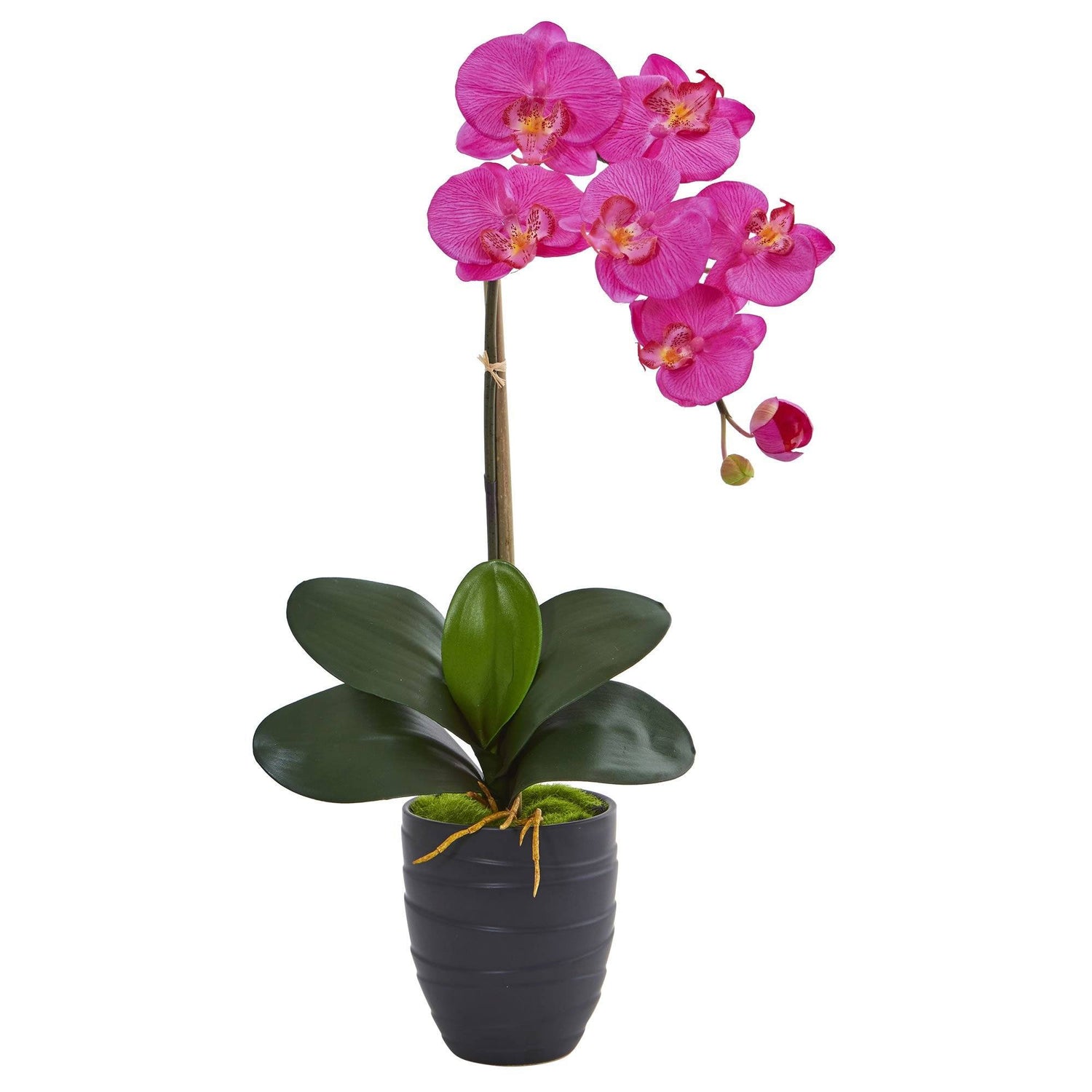 A single faux phalaenopsis orchid rises from a simple black ceramic vase in this elegant arrangement. Reminiscent of asian flower arrangements, this artificial phalaenopsis orchid will bring a feeling of tranquility to any room in your home or office.