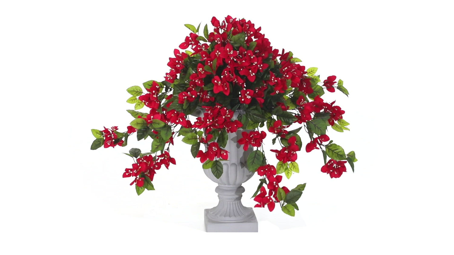 This bougainvillea arrangement can be used in all climates and seasons since the artificial vines and leaves require no care. Spilling over the gray urn, these bright flowers make the perfect statement in any space. Pair two on columns for a Victorian feel or place in the dining or sitting areas to bring the tropics indoors. Gray urn is included in this arrangement. Adjustable stems and leaves offer a unique design element to this full, lush arrangement. UV resistant vines makes this item good for indoor or outdoor use.
