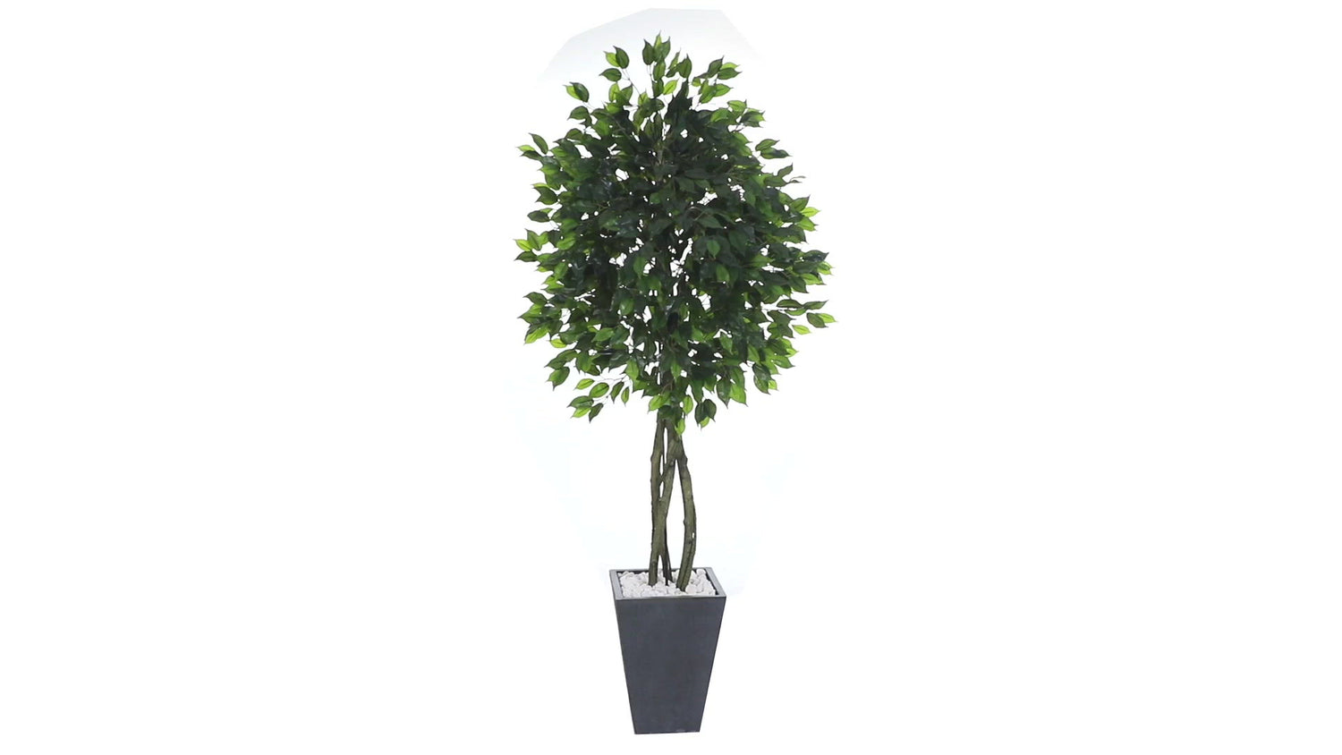 Gracefully drooping branchlets and glossy, oval leaves give this 6' Ficus Tree a full and abundant look. The intertwined trunk is keeping with the authentic ficus. Paired with a slate colored planter full of white pebbles for a decorative accent. Place this Ficus Tree in a study, entryway, sunroom, or patio for a year-round natural accent.