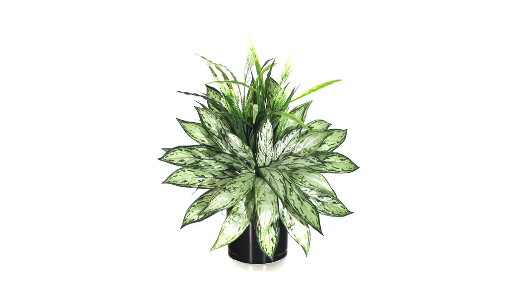 This eye-pleasing silver queen and grass artificial plant features artfully arranged variegated green leaves that gently splay outwards to reveal small, delicate blooms and long, thin green leaves. With a clean and simplistic appearance, this 20-inch ornament will bring sophistication to your interior space, especially when placed on a dining room table with a lace doily underneath. A minimal black vase comes included.
