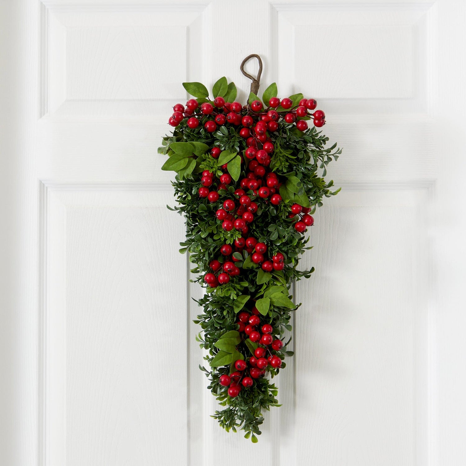 True-to-life boxwood hangs in a unique teardrop arrangement to cascade across the fireplace mantel, dinner table or entryway. Greet guests with faux seasonal berries, handcrafted and arranged to perfection for your holiday home. Contrast with white décor for a contemporary feel, or pair with rustic and antique seasonal finds for a farmhouse look.