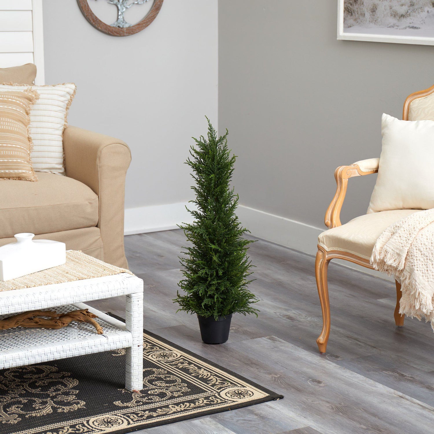 Create a cozy scene during your next dinner party with this Spiral Cypress Artificial Tree. Realistic, groomed cypress fronds are shaped into a spiral silhouette. Recreate the look of your favorite outdoor restaurant from the comfort of your own backyard or patio. Standing 2.5' from a nursery planter, curate in indoor / outdoor areas that need some light and shape. Perfect for apartments, balconies, backyards or patios.