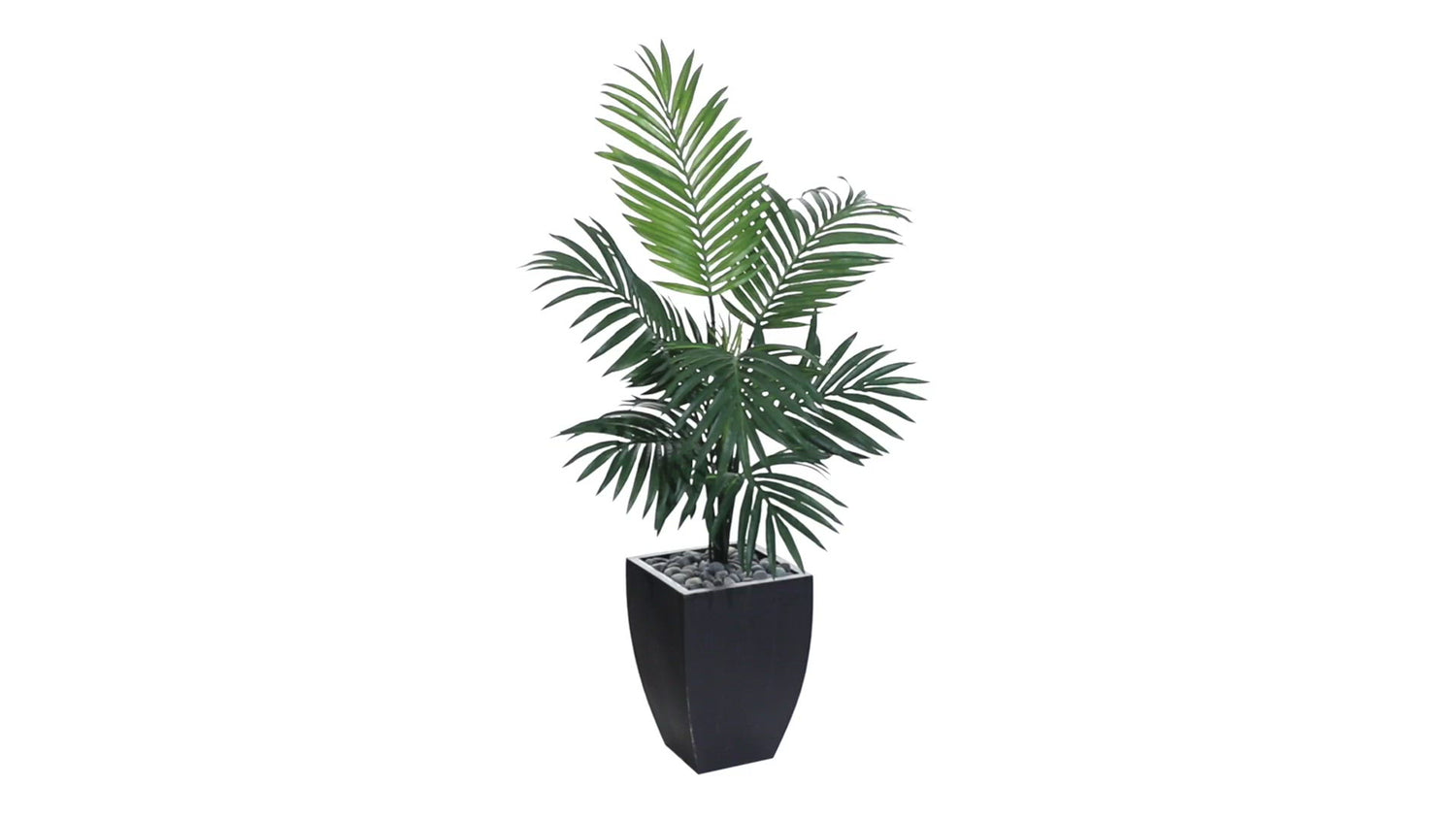 Bring this showstopper into your living room or entry area for an immediate improvement. This stunning artificial Kentia palm tree will add the touch of a professional decorator without the price tag. Comes in an elegant black wash planter with gry river rock.