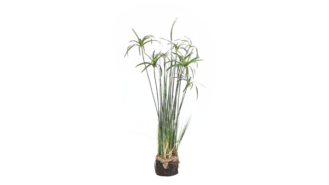 Standing a tall 48", this faux Papyrus plant features alternating stalks of greenery for added depth and dimension. Vibrant green hues mix with a faux dirt base for a realistic look. Place this stately plant in a glass vase or colorful urn to add height in a decorative display.