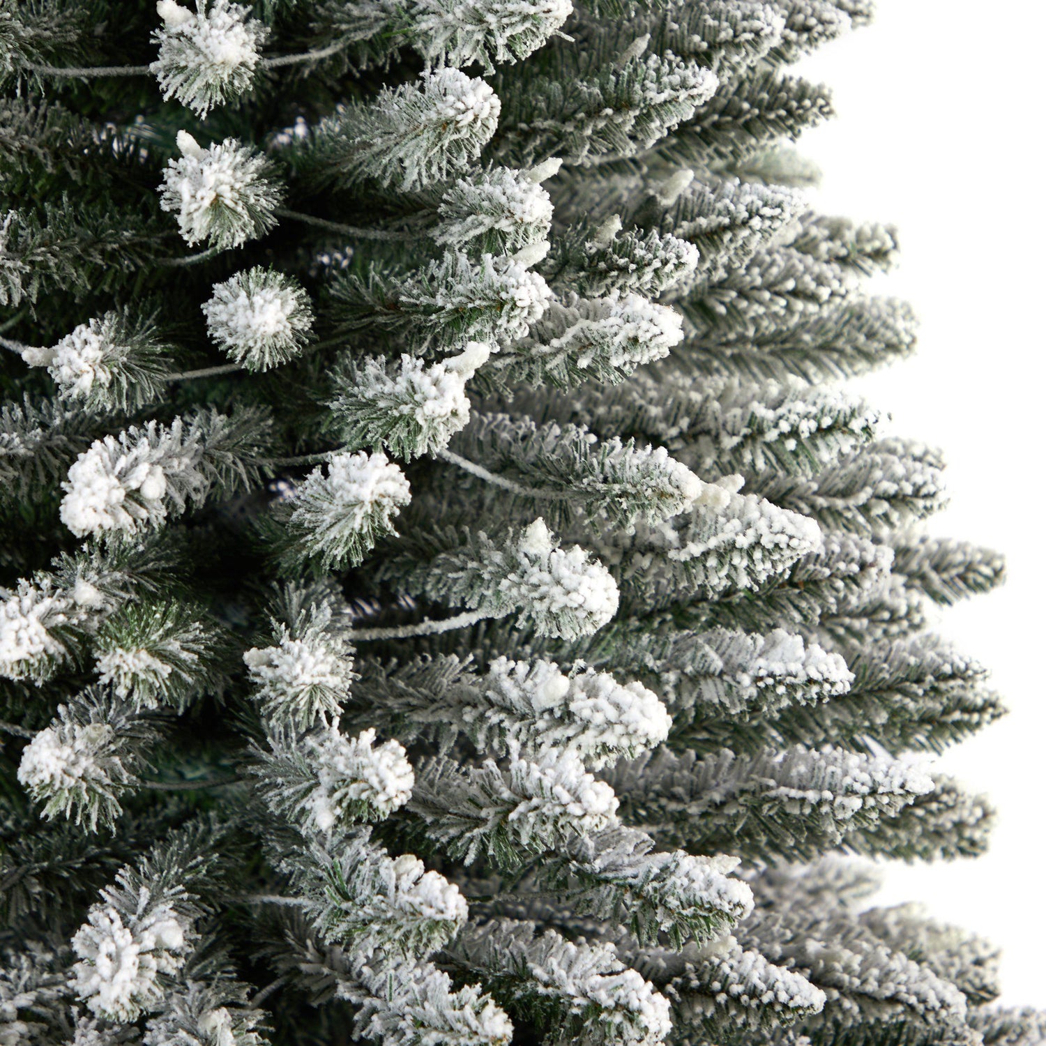 Create a winter wonderland scene in a limited space environment with the help of this pencil slim, flocked artificial Christmas tree! Perfect for tall, tight spaces because of its narrow, pencil-like design, it boasts tiers of evergreen foliage made up of 1819 easy-to-bend branch tips for showcasing your favorite holiday ornaments, all beautifully flocked with faux snow to evoke a winter setting. Comes pre-strung with 1000 clear lights. Carefully stabilized on a metal stand, this space-saving 12’ tall pencil slim artificial Christmas tree will not only make decorating a breeze but ensure your home is looking picturesque all throughout the holiday season.