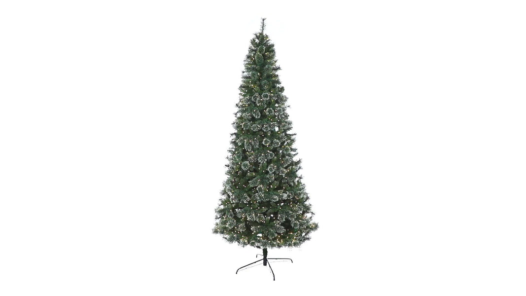 Create the ultimate holiday scene in your home or office with the help of this evergreen artificial Christmas tree; entirely maintenance-free, this realistic looking Christmas tree boasts a rich collection of pine foliage made up of 3470 easy-to-bend branches to hang all of your favorite holiday ornaments. Arriving pre-strung with 800 clear LED lights to eliminate tangles and stabilized on a metal stand, this impressive 9’ tall Christmas tree will not only make holiday decorating a breeze but ensure your home is always holiday-dressed for years to come.