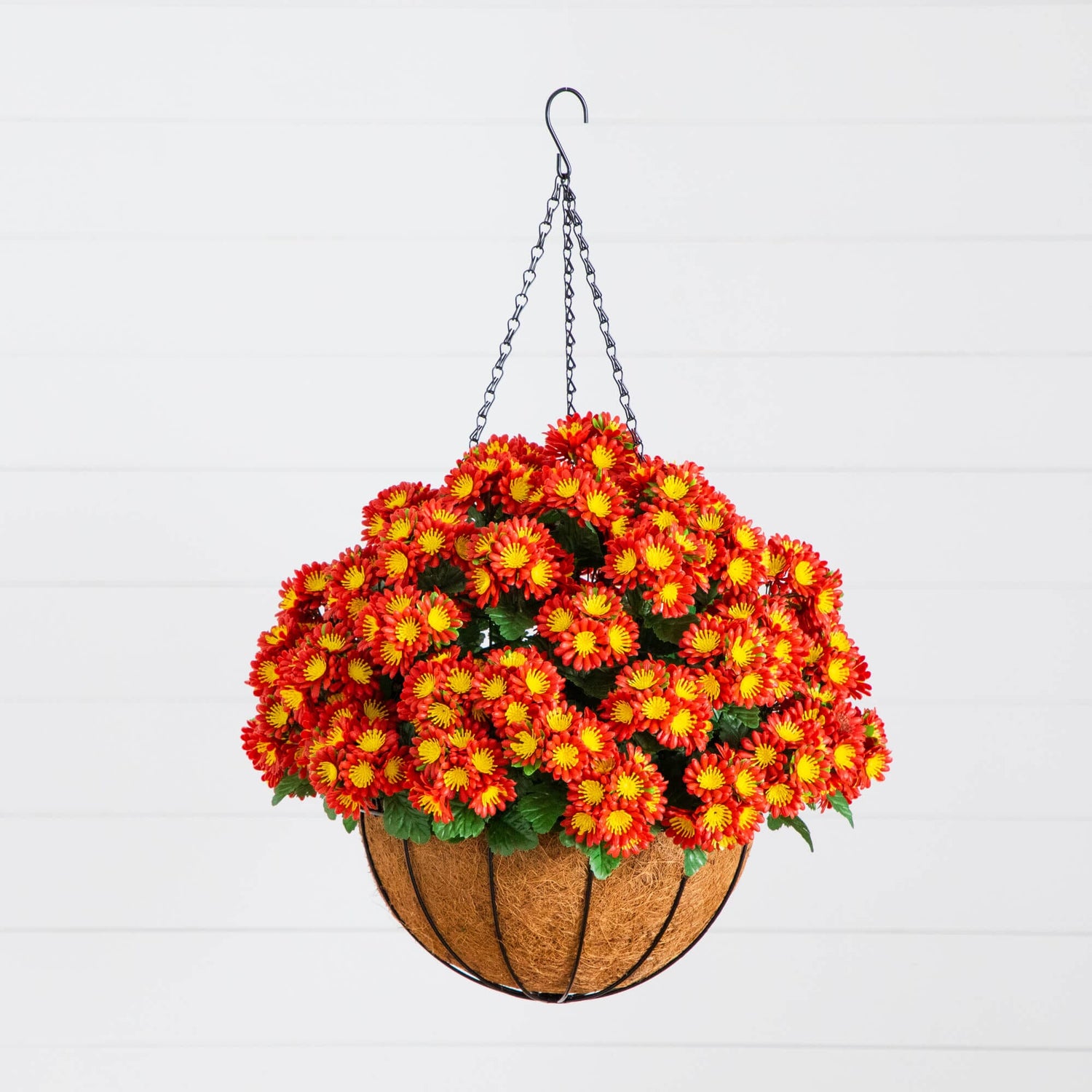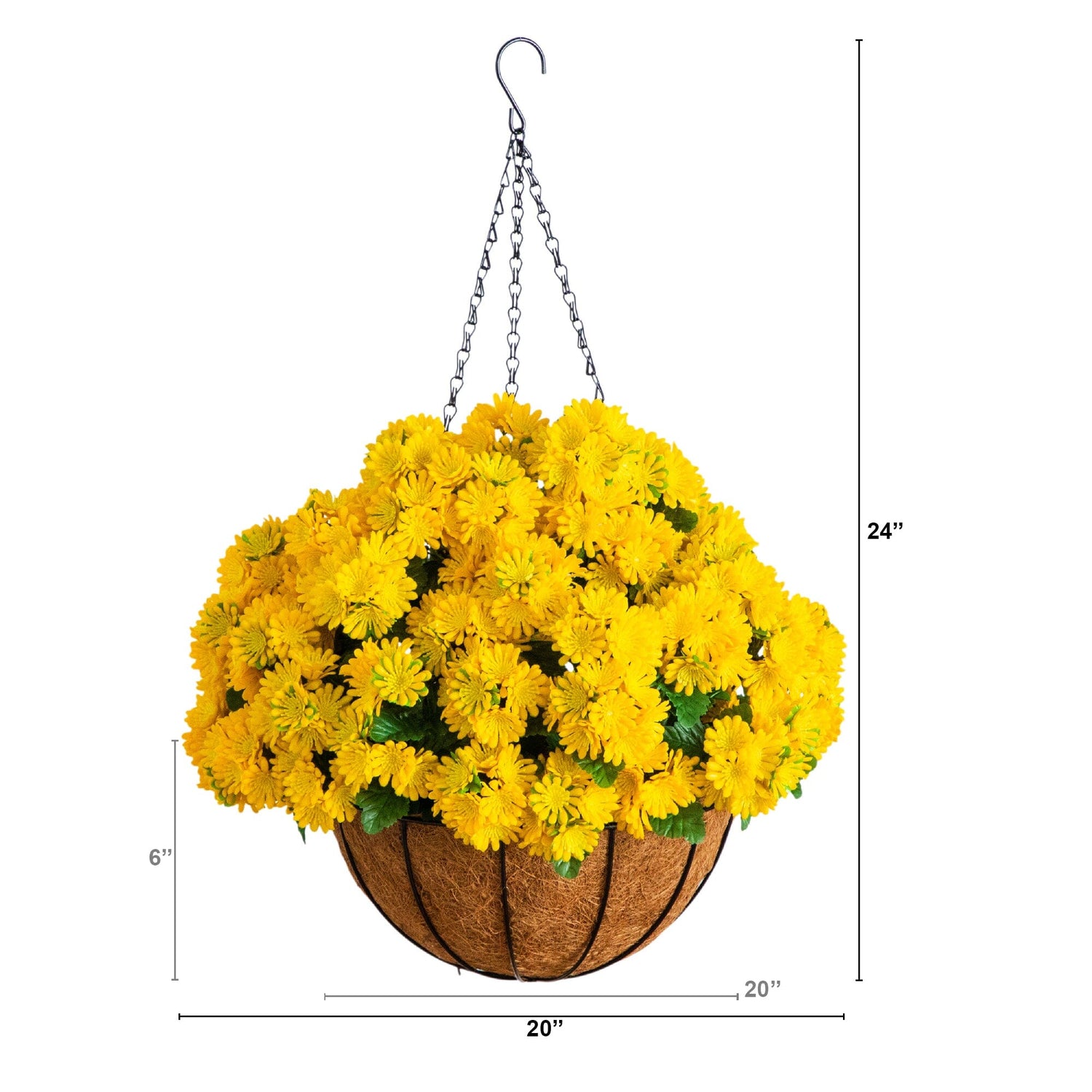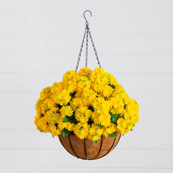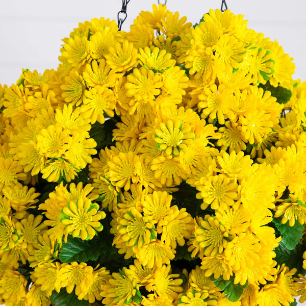 Revitalize your space with our UV-resistant Chrysanthemum Hanging Basket, bringing the beauty of blooming chrysanthemums to your home all year long. Crafted from premium materials, this hanging basket captures the essence of a blooming garden, with lifelike flowers that will stay vibrant no matter the season. Designed to be UV-safe, it’s perfect for both indoor and outdoor use. Whether you're brightening up your front porch or creating a tranquil garden retreat, this 24-inch chrysanthemum suspended from a coconut-lined basket is the ideal way to elevate your space and re-create your dream garden.