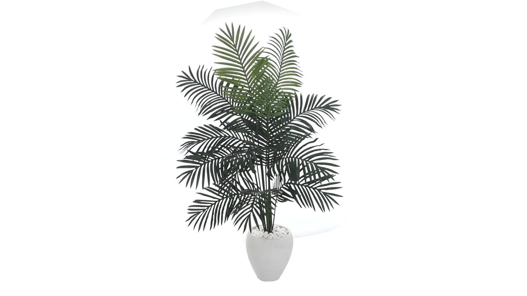 This paradise artificial tree stands at 5.5-feet. The height of this decor will tower over any other ornaments and be the main focal point in any setup. With a textured white planter included, the giant green fronds of this artificial paradise palm will provide a beautiful accent color in your dining room when placed in a corner near the table. Complement the piece by adding white, silver, or crystal clear glassware on the tabletop for a polished finish!