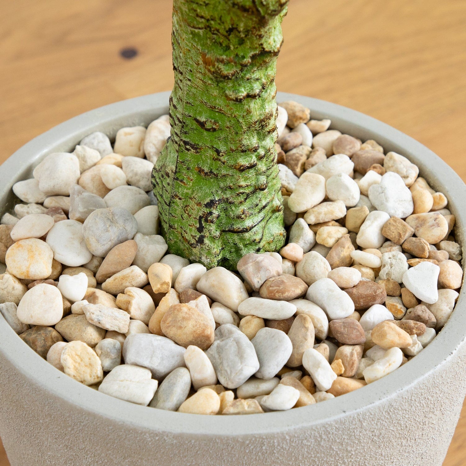 Tall and elegant, this plumeria artificial tree nestled in a decorative planter is perfect for tight hallways or dull corners. It's also indoor/outdoor safe which makes it perfect for a sunny spot inside your home or outdoor on your patio. With its realistic trunk that rises with several layers of lush green leaves and fresh flowers, it'll effortlessly lend a verdant touch to a neutral-hued living room. You can place it near your white sofa to create a calm and relaxing setting. It comes with a realistic river rock.