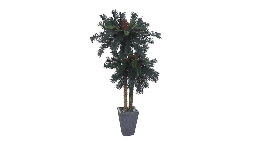 This 6-foot double sago artificial palm tree will make you believe you've brought home a slice of the tropics. Two realistic shoots come out of a gray slate finished planter with natural river rock and rise into a thick, realistic display of palm branches. This piece would look great accenting a bookcase or in an entry.