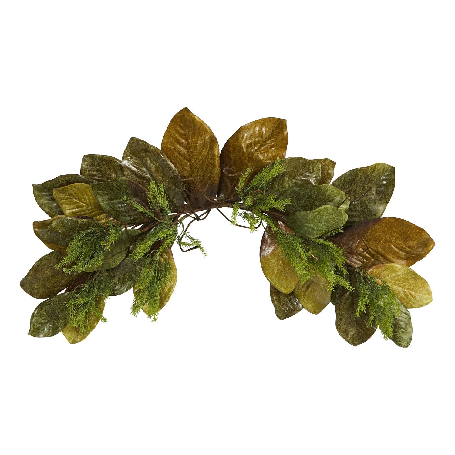 This fall update your vertical spaces and surfaces with the help of this artificial swag. Intricately designed with a rich collection of oversized magnolia leaves, it comes handsomely complemented with mixed grasses - all of which look incredibly lifelike – to help inject verdant greenery into everyday environments. Perfect for sprucing up a bare mantle space, an empty window ledge, or completing your holiday tables-cape, this 35” long decorative swag would undoubtedly create a picture-perfect focal point wherever displayed.