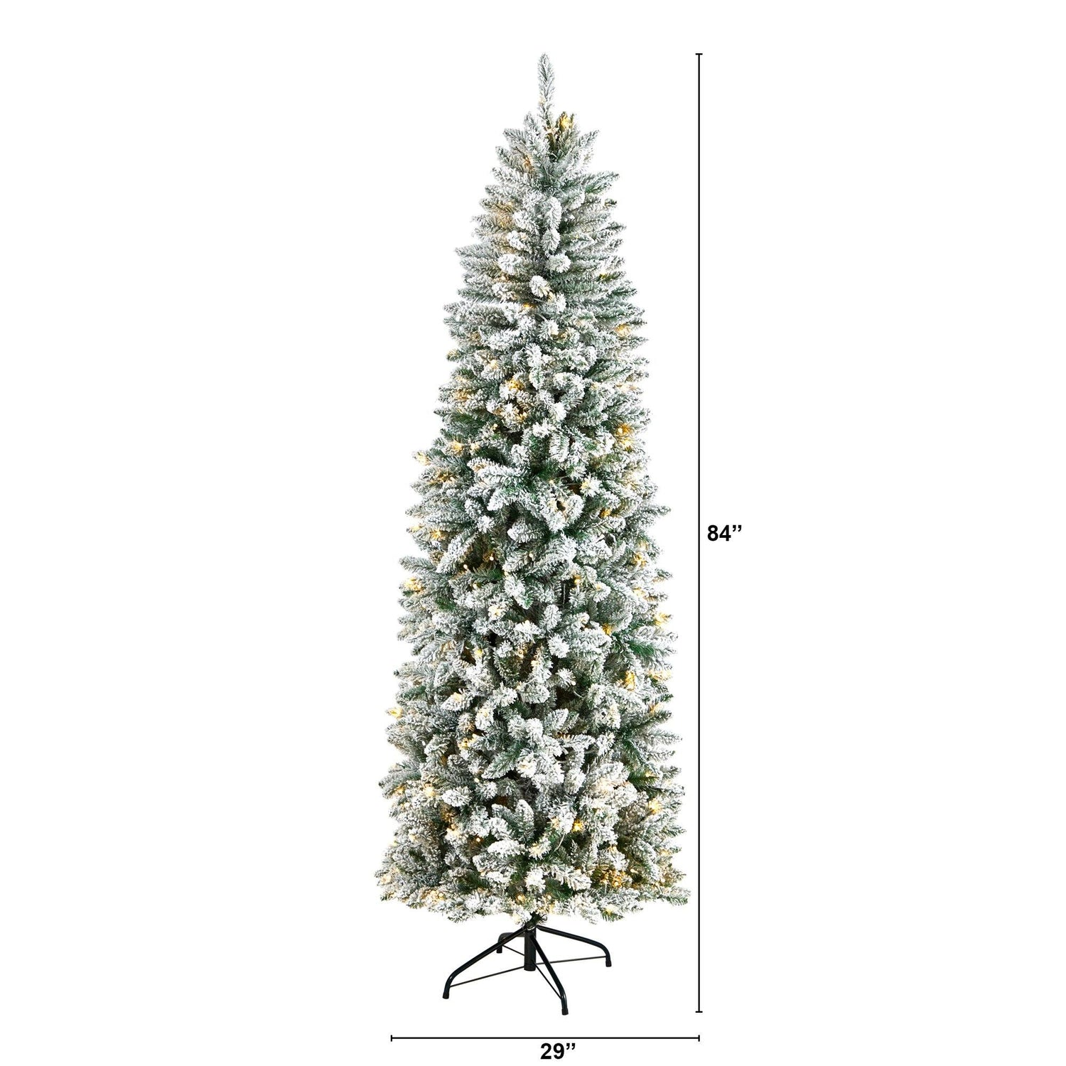 Transform your home into an enchanting winter wonderland with this flocked Artificial Christmas Tree. If you dream of a white Christmas, these artificial trees are designed to mimic the texture and foliage of real trees with their upward sloping branches that can easily house mini ornaments. Pre-strung with 300 LED lights for a warm, candle-like glow, all that’s missing are your ornaments. Standing at 7’ from a metal stand (included in height), this flocked tree complements spaces that need some Christmas love. Everyone can have a white Christmas even if they live in the tropics.