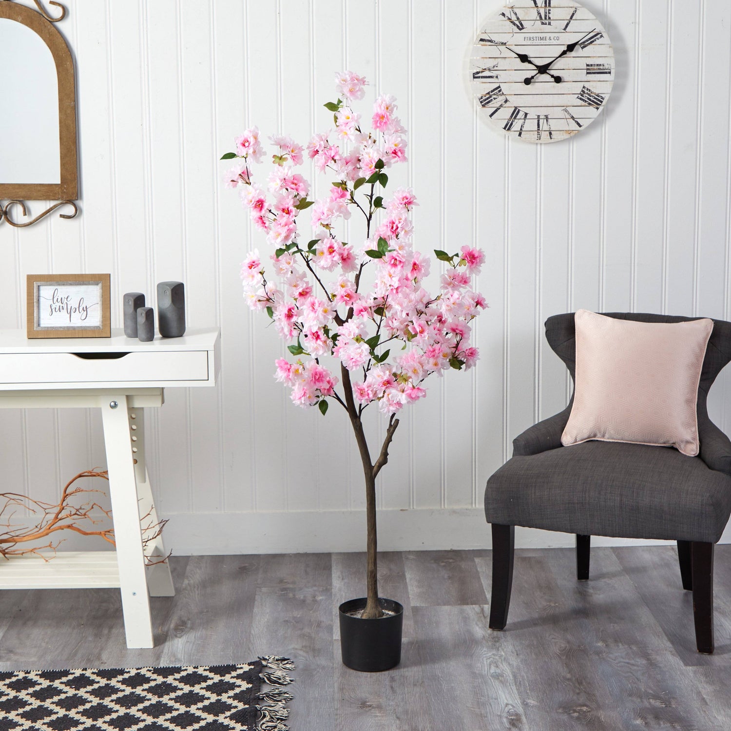 Enjoy the wonders of the majestic spring awakening with this Artificial Cherry Blossom Tree. Incredibly lifelike pink cherry blossom flowers adorn a slim, brown trunk in a rhythmic melody of pink foliage for a full look that will instantly transform your home into the best of Japan. The pink flowers have shades of white and are accented by green leaves for a feminine touch that softens spaces. Standing 5' from a nursery planter (included in height), curate in tight areas that want to feel pretty in pink. Perfect for bedrooms, bathrooms, awkward corners, or kitchen nooks.