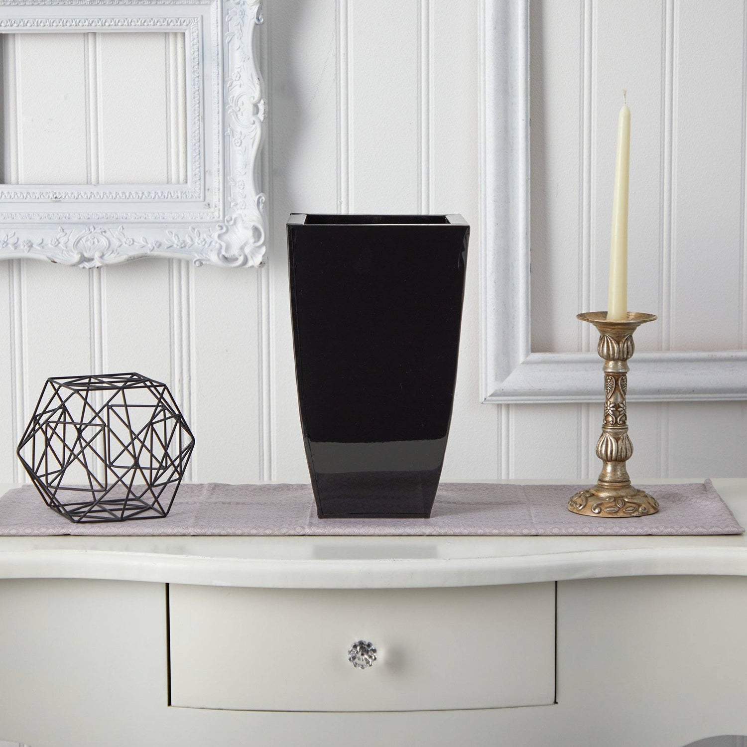 Enhance your home with a metal patterned planter. This chic geometric pot will add texture, depth and color to any space that needs an elegant touch. House your favorite Fiddle, Ficus, or Palm tree for an updated, modern look. Standing 13", modernize any space in need of some greenery. Add to a dining room, kitchen or bedroom.