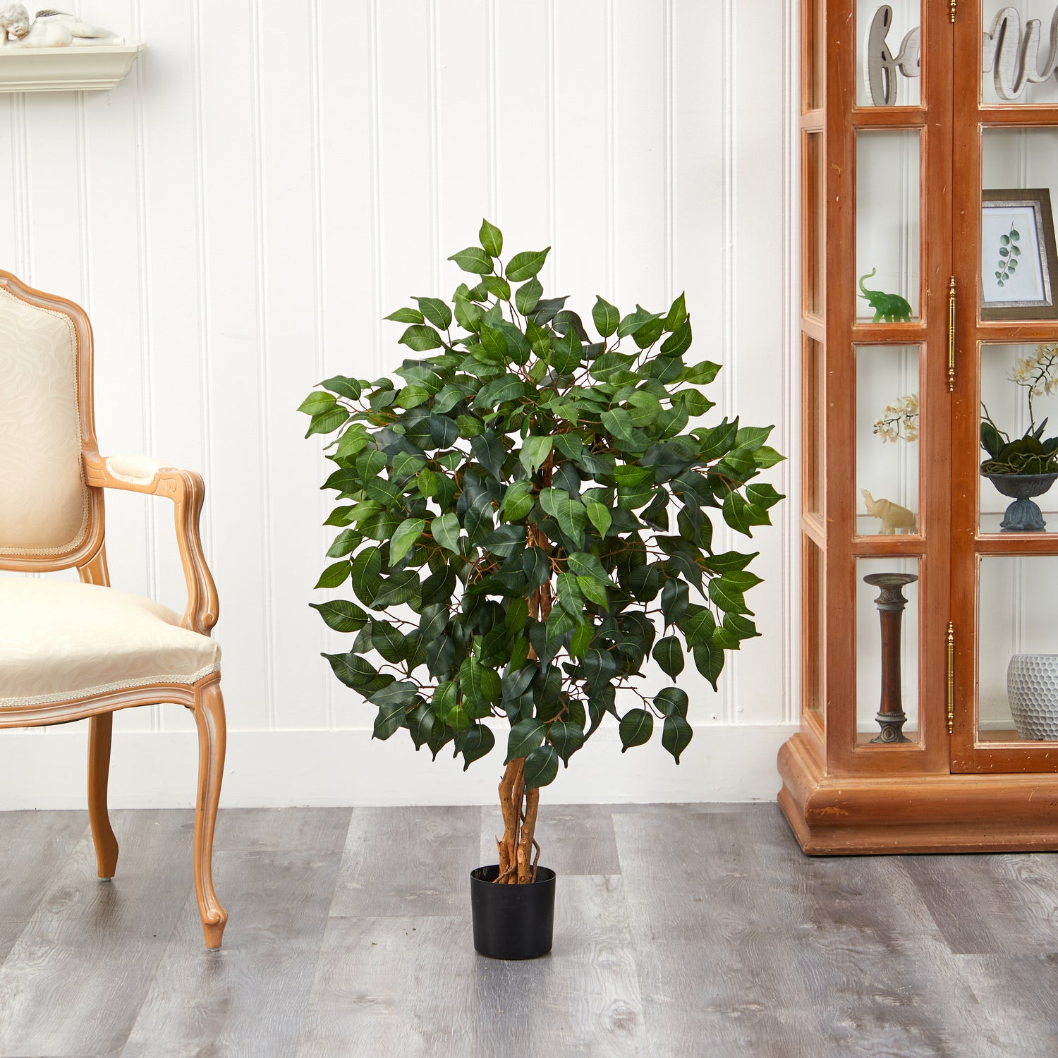 Stately and unique, the Ficus tree is one of most interesting trees around, and will make the perfect complement to any home or office décor. The twisting trunks reach skyward, and suddenly burst into an explosion of green. With 378 leaves, this tree will fool even the smartest of birds, so watch for nests when you dust! Comes in a black pot with faux soil.