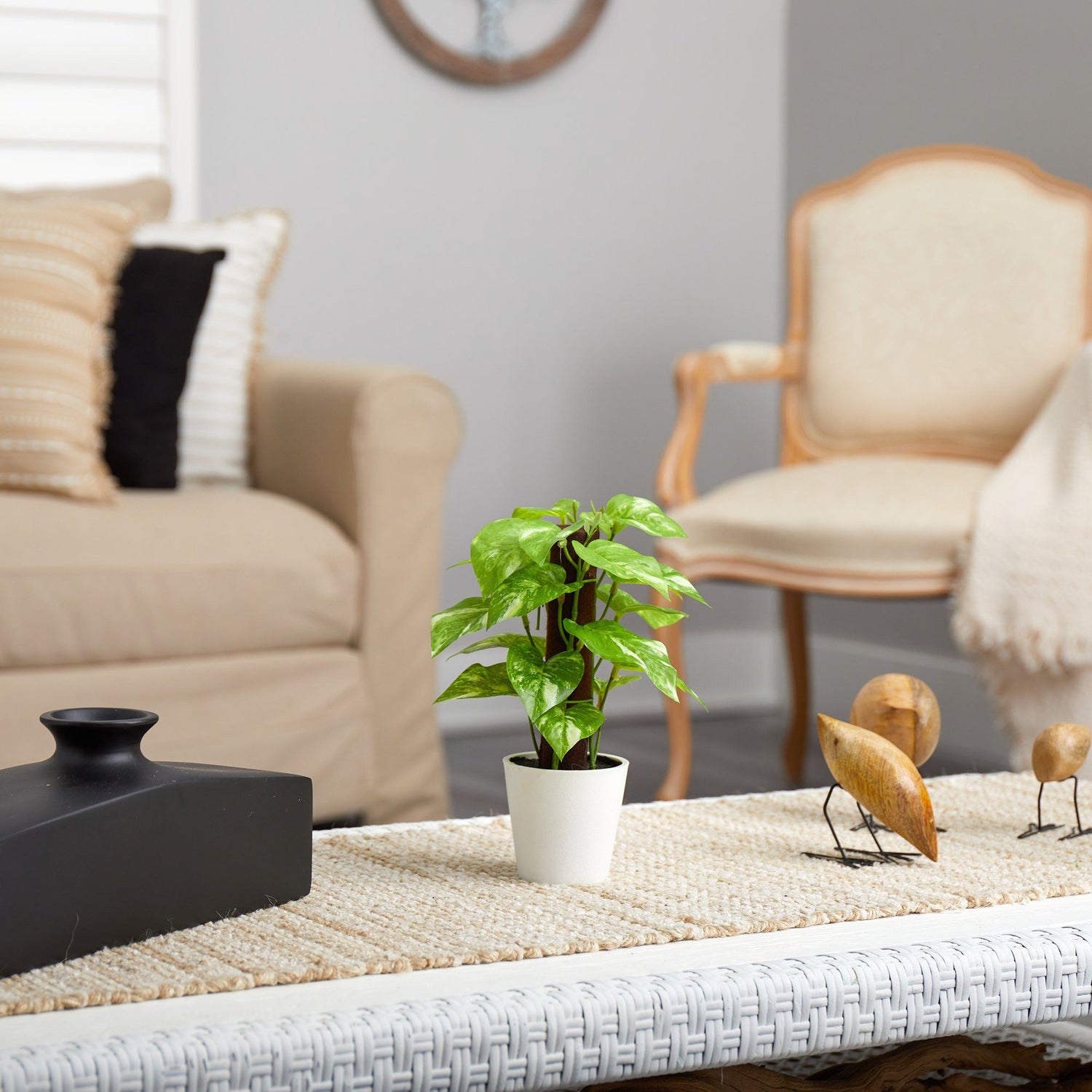 Bring the outdoors in, by that we mean tropical jungles, with this Pothos Artificial Plant. Cascading rich green leaves stem from a brown, thick trunk that looks incredibly lifelike. Standing 9’, from a white planter (included in height), add this piece to desktops in need of some green. Perfect for offices, kid’s rooms, kitchen nooks, or bathrooms.