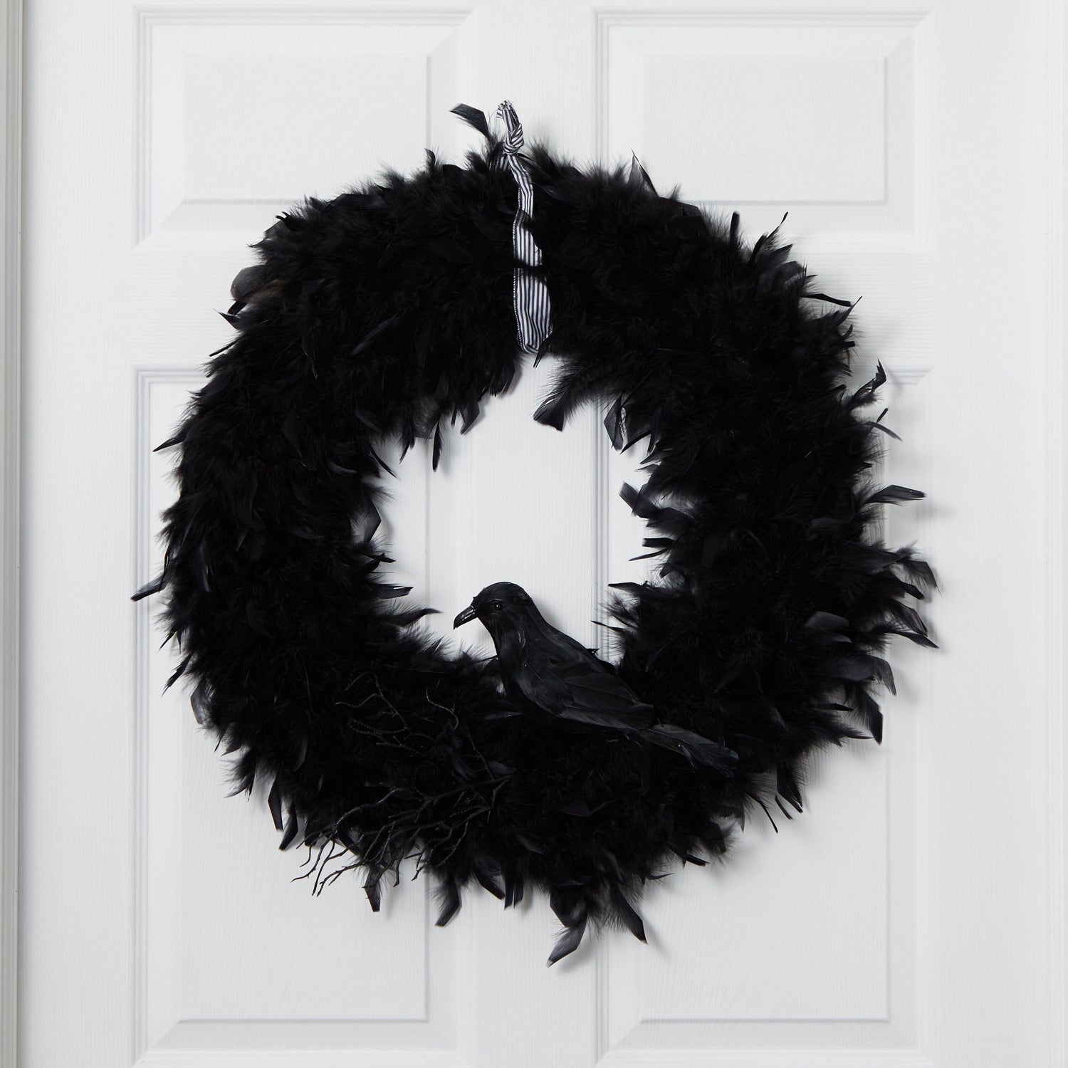 Have a dark Halloween this season with the Feathered Halloween Wreath with Decorative Raven. If you're looking to display mystery and intrigue, or just a fan of the color black, display the raven proudly to scare the goblins and ghosts. We guarantee this will be a crowd-pleaser and conversation starter. With a diameter of 30" hang in any door or wall. Get spooky every Halloween season