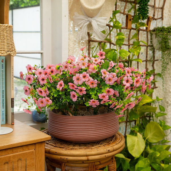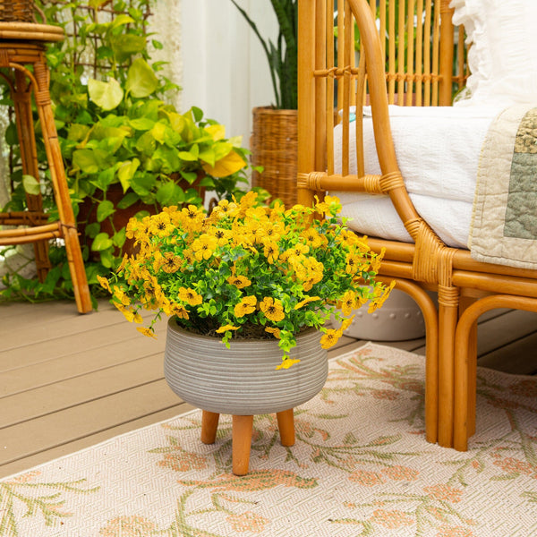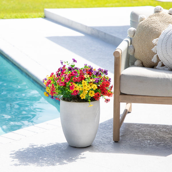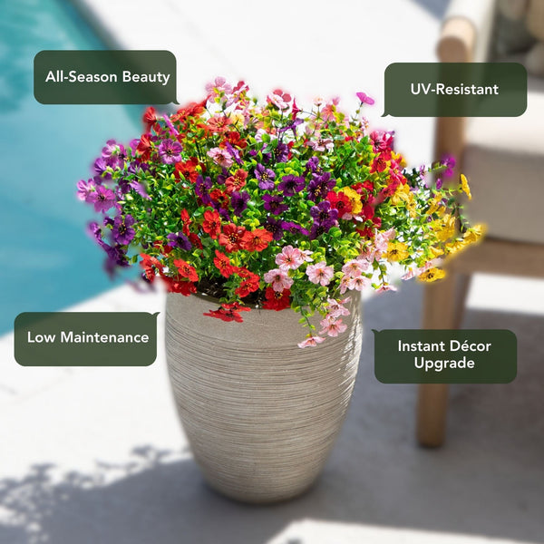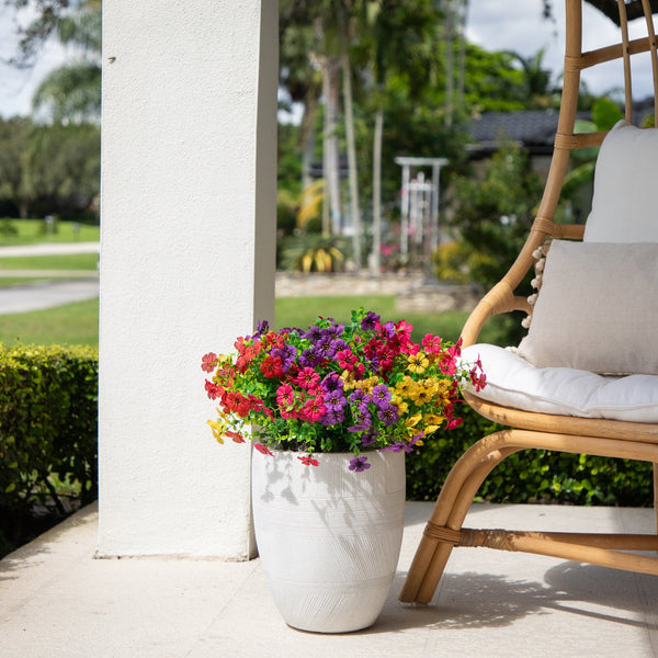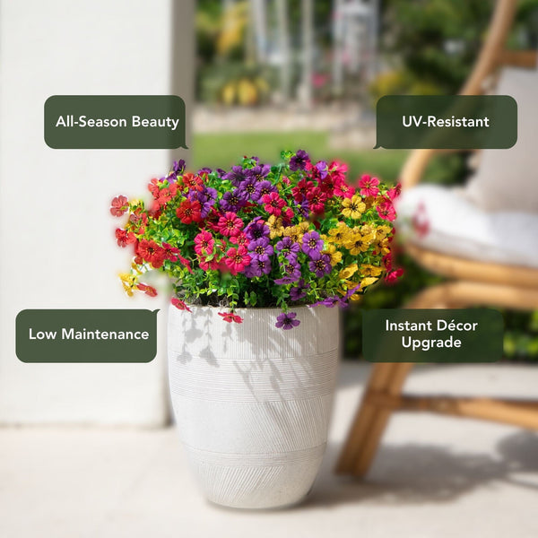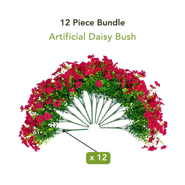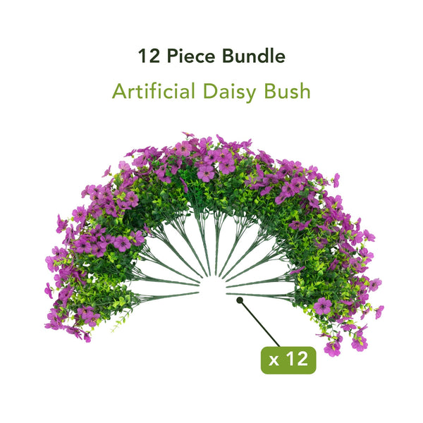 Bring cheerful, lasting color to your home or garden with this 13-In UV resistant artificial flowering daisy bush set. Each lifelike stem showcases vibrant petals with sunny yellow centers, capturing the charm of fresh blooms in every detail. Designed for both indoor and outdoor spaces, these versatile faux florals are flexible, customizable, and effortless to style in planters, window boxes, or seasonal arrangements. With a set of 12 stems, you can instantly create a full, lush display with no watering or upkeep required. Enjoy the beauty of daisies year-round, rain or shine. Brighten your front porch or patio by tucking them into planters, layering them in baskets, or mixing them with greenery for a welcoming look and instant curb appeal.