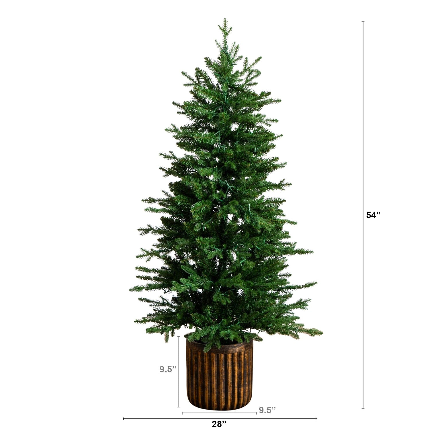 Bring holiday cheer to your space with this pre-lit artificial Christmas tree. The realistic, full branches are pre-lit with 400 clear energy-efficient LED lights that create a cozy glow throughout the needles, eliminating the hassle of adding lights yourself. Crafted from high-quality materials, bend the branches to fit in your space and house your favorite ornaments and decorations. Standing 4.5-Ft from a decorative planter, the container provides stability that complements many decor styles. This elegant tree complements spaces of all sizes and brings a warm, festive glow, perfect for offices, living rooms, foyers and more.