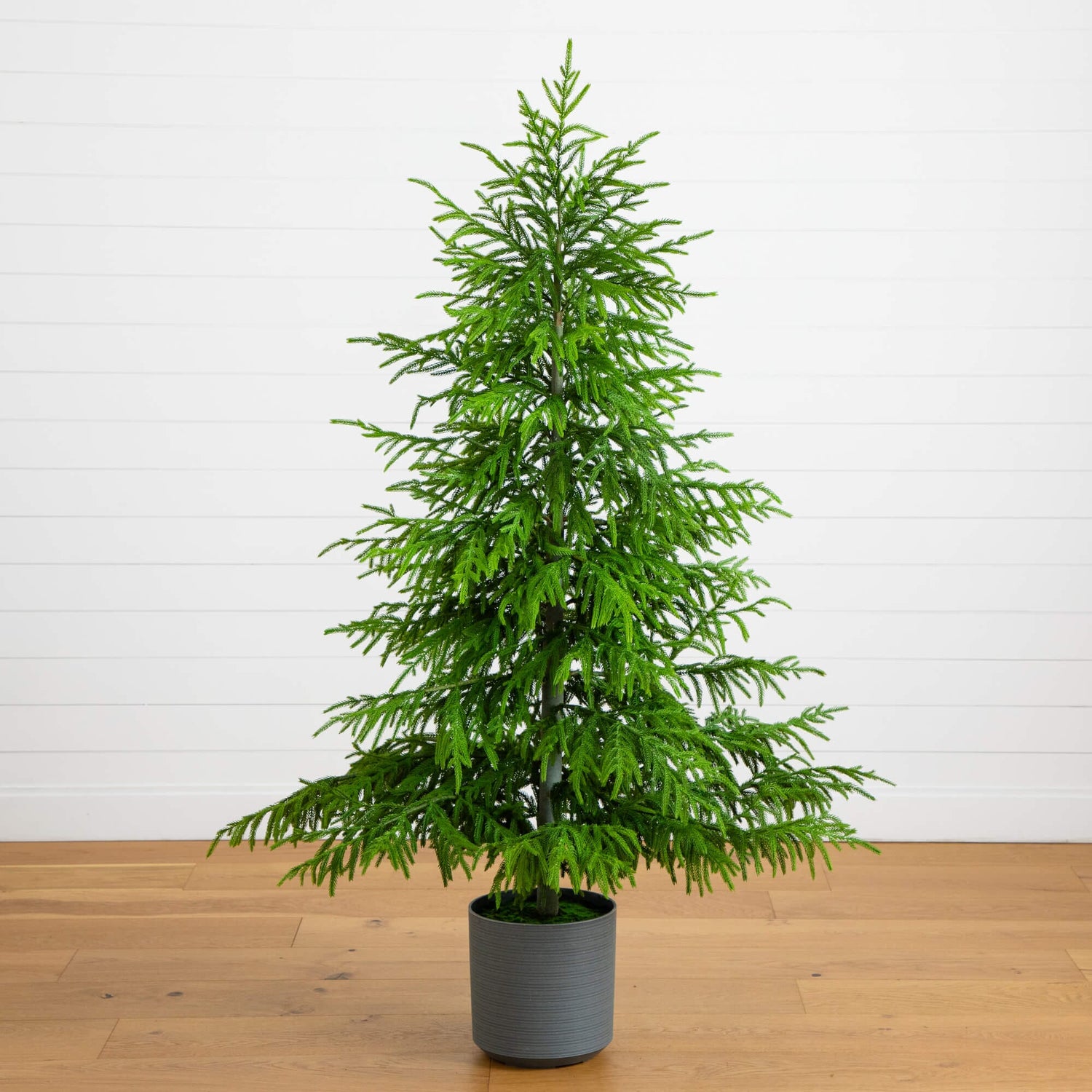 A gorgeous, lush tree inspired by the verdant Pacific coastline of New Zealand, this artificial Norfolk Pine tree boasts lush, green foliage for a robust, full appearance, yet requires no maintenance at all. You'll notice the attention to detail in its natural look and Real Touch branches that are bendable to fit any space. Enhance your Christmas decor with the artificial Norfolk pine by adding twinkling fairy lights or colorful ribbon garlands. Standing 6-feet from a nursery planter, create your dream home today by adding to a base of your choice. Enhance any space today no matter your decor style and spread cheer.