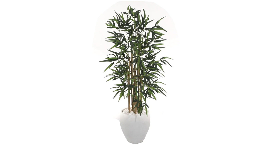 A dense cluster of stalks and numerous realistic leaves made from the finest materials make this beautiful faux bamboo tree nearly indistinguishable from the real thing. And the best part is that you don't have to worry about water on your floor, because it's faux! The oval white textured planter with white river rocks comes included.