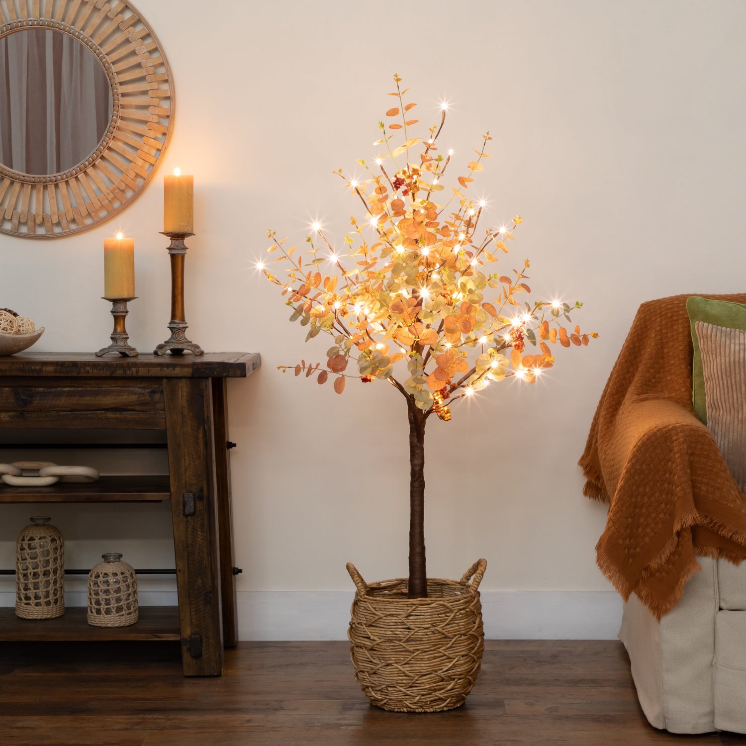 You know when the season is changing hues and the air is crisp, this autumn eucalyptus artificial tree brings that feeling. Inspired by a forgotten forest, the leaves are in different shades of green, orange and yellow hues to showcase the maturing of the leaves. Crafted from high-quality materials, pinecones and berries accent the branches for texture and an organic touch. Pre-lit with 60 warm white LED lights, set this piece anywhere for a cozy, moody glow. Standing 4-Ft from a sturdy base, display in a planter of your choice. Our designers love it for kids' room, offices or coffee tables.
