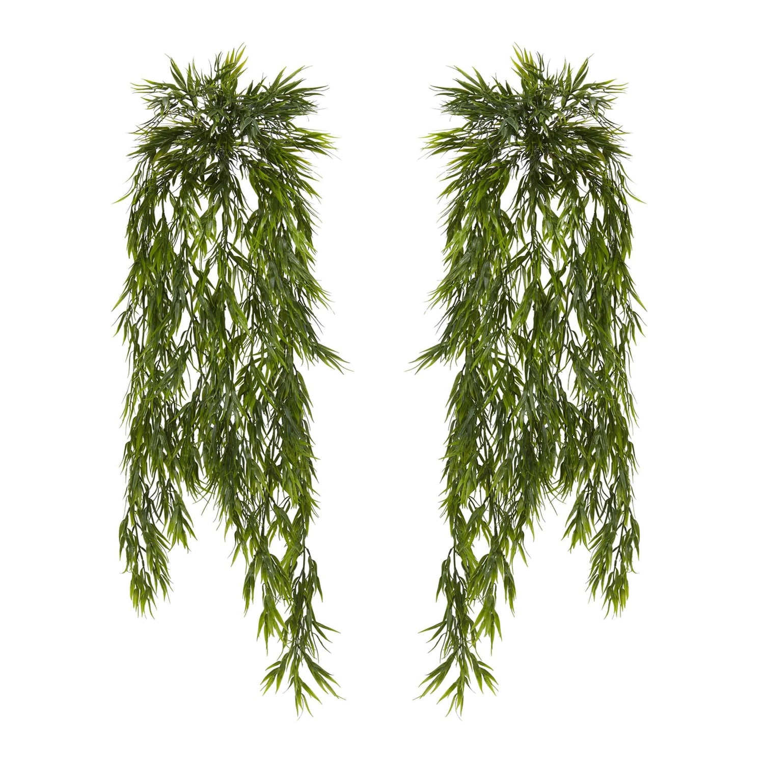 Grasslike foliage of thin-bladed leaves cascade down like a verdant waterfall. The various shades of green give the Bamboo Hanging Bush a textured and dimensional look. Place on a high shelf or hang from the ceiling for an oriental inspired look.