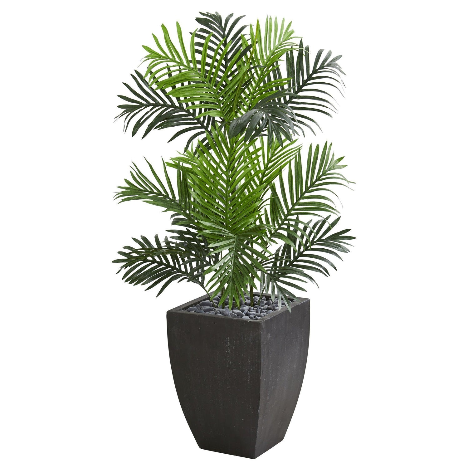 This lifelike paradise artificial palm tree will add life and a fresh green accent to your master bedroom. Light and dark hued green foliage spreads out in different directions, all contained within a contemporary black planter topped with river rocks. For a tropical inspired look, place this piece on either side of your entryway door, behind an armchair, or next to a bookcase. Be sure to add flowering plants with colorful blooms on your living room end table to accent the green foliage of the artificial palm tree.