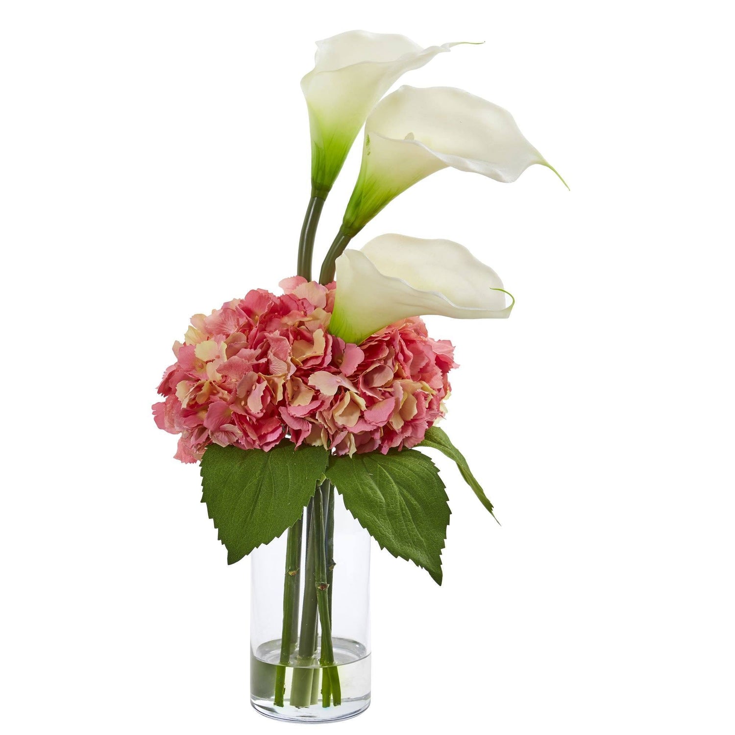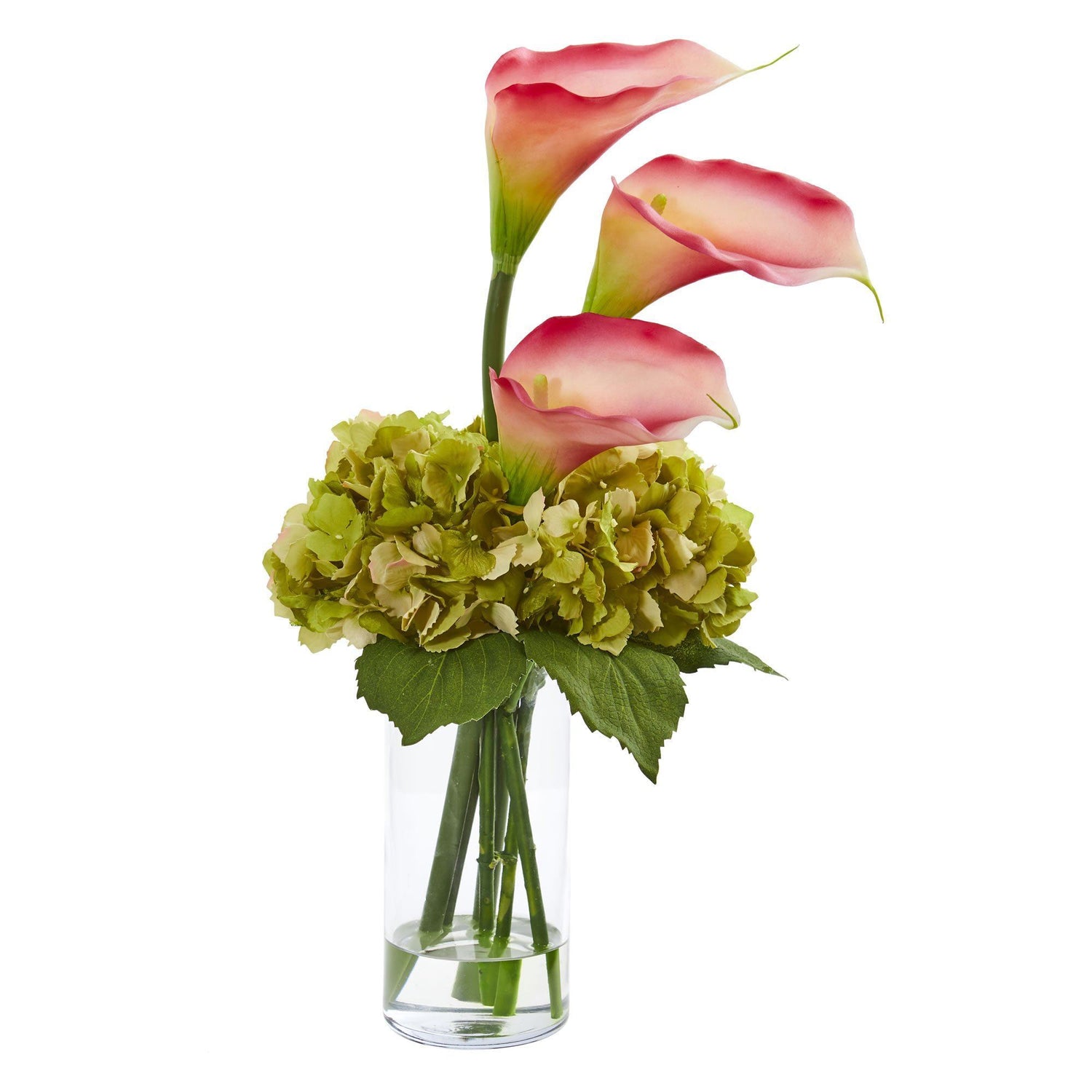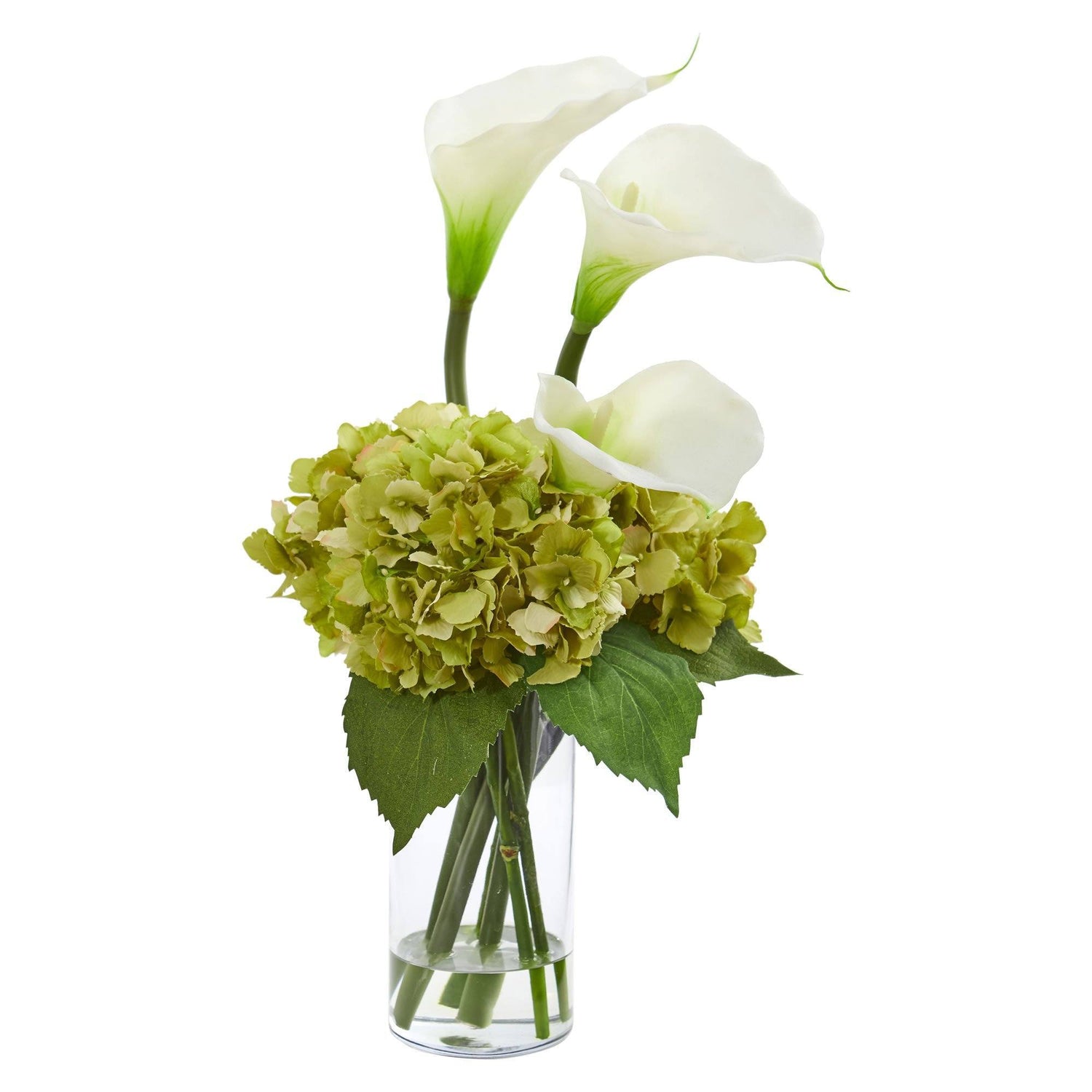 You will definitely create interest and draw people's attention with this lovely 18-inch artificial calla llly and hydrangea arrangement. It has fresh looking petals that blend seamlessly into the green leaves and long stems, all nestled in a simple clear vase. This arrangement will bring a pop of color to your dining or living room table when placed as a centerpiece together with bright vases and glassware.
