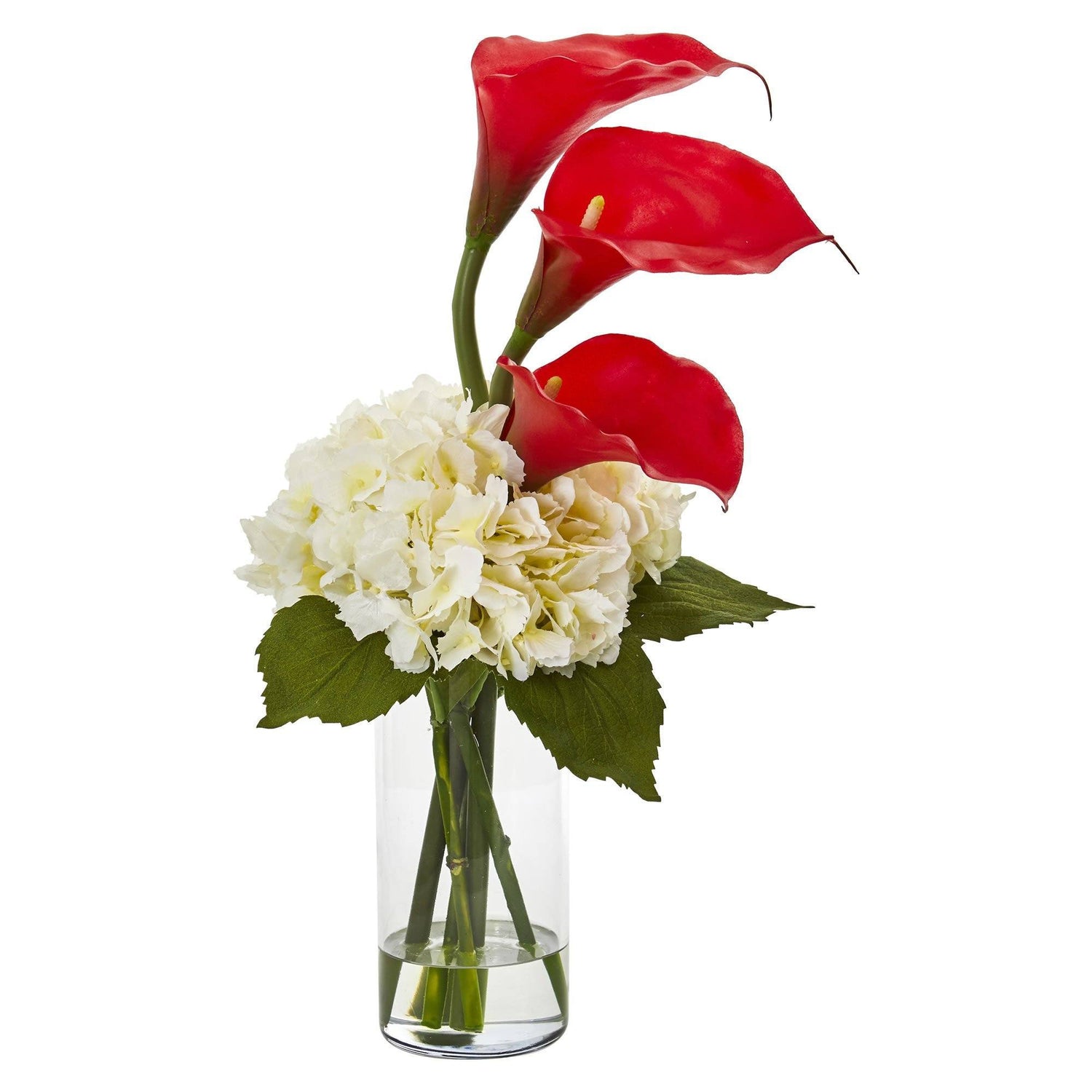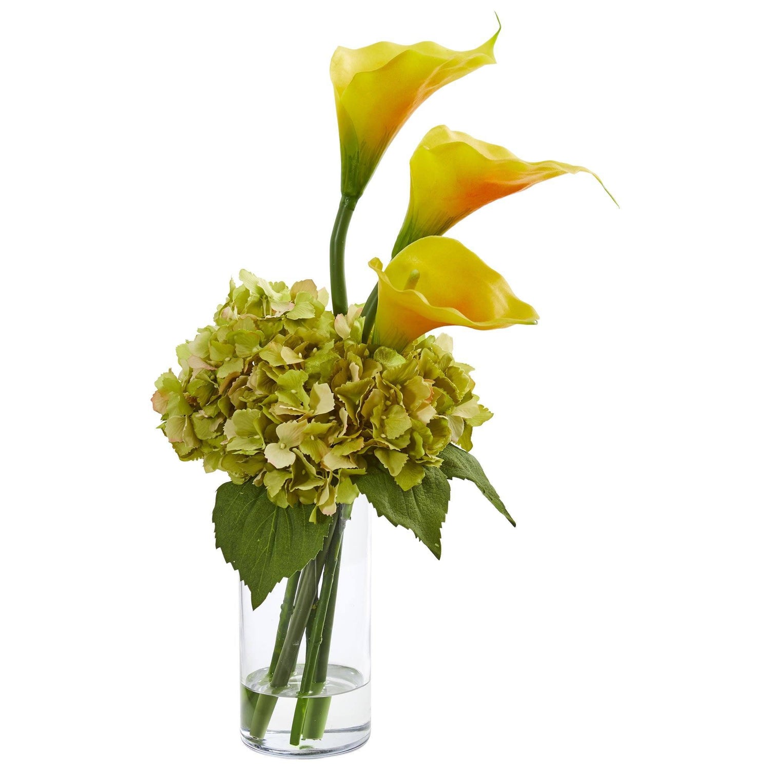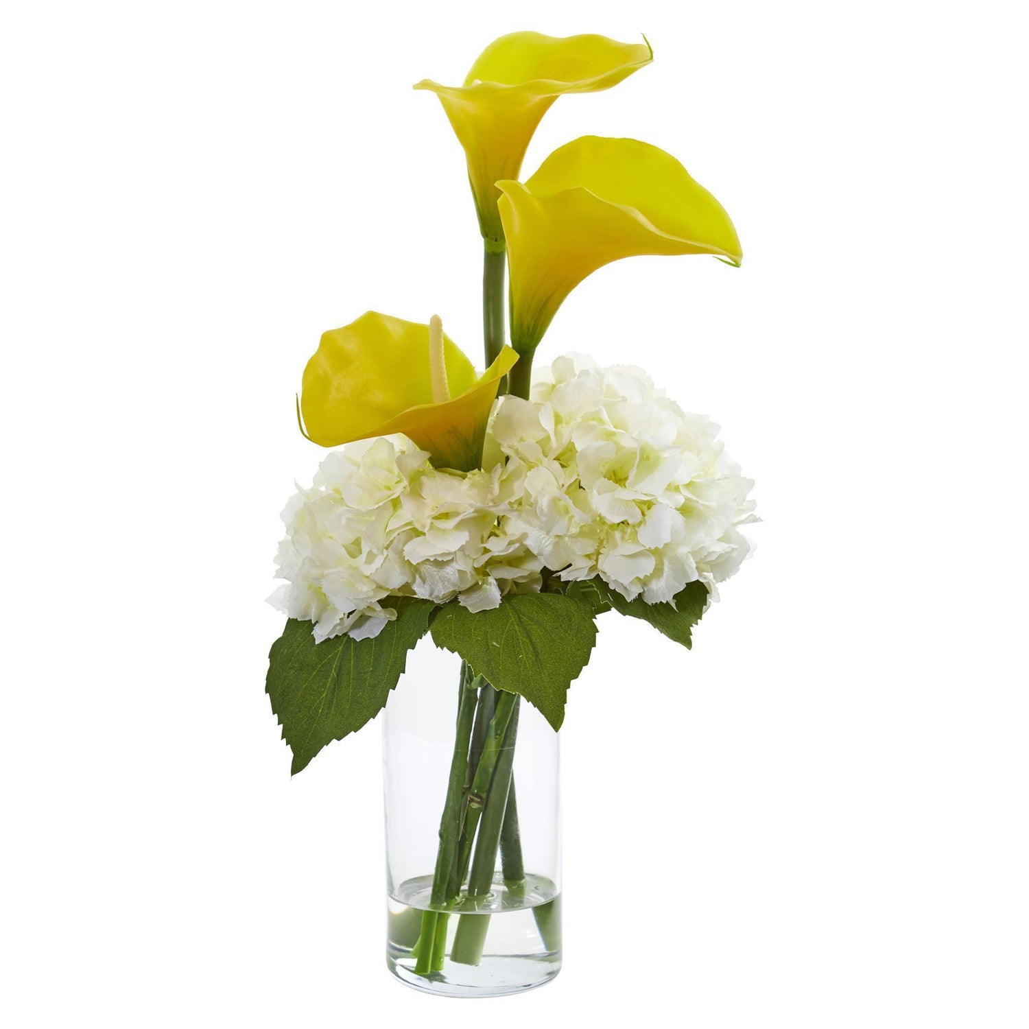 You will definitely create interest and draw people's attention with this lovely 18-inch artificial calla llly and hydrangea arrangement. It has fresh looking petals that blend seamlessly into the green leaves and long stems, all nestled in a simple clear vase. This arrangement will bring a pop of color to your dining or living room table when placed as a centerpiece together with bright vases and glassware.