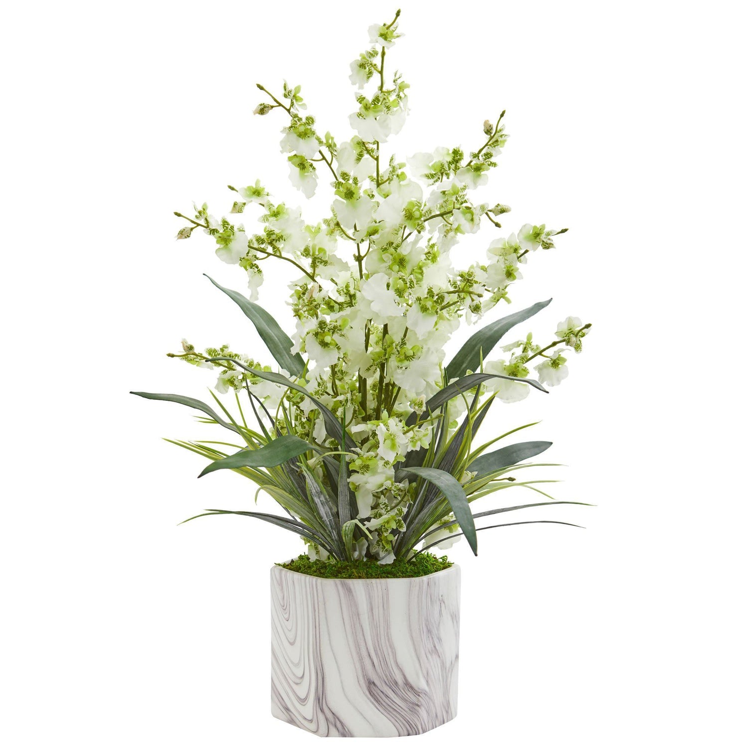 This cheerful artificial dancing lady orchid arrangement will instantly brighten up your home or office space. With a bundle of lush vibrant blooms and sharp green leaves, all bursting forth out of a beautiful marble vase, it’ll make one gorgeous décor piece in your dining room. Place it on a sideboard near your wine glass holder or add it to your foyer console table to greet guests.