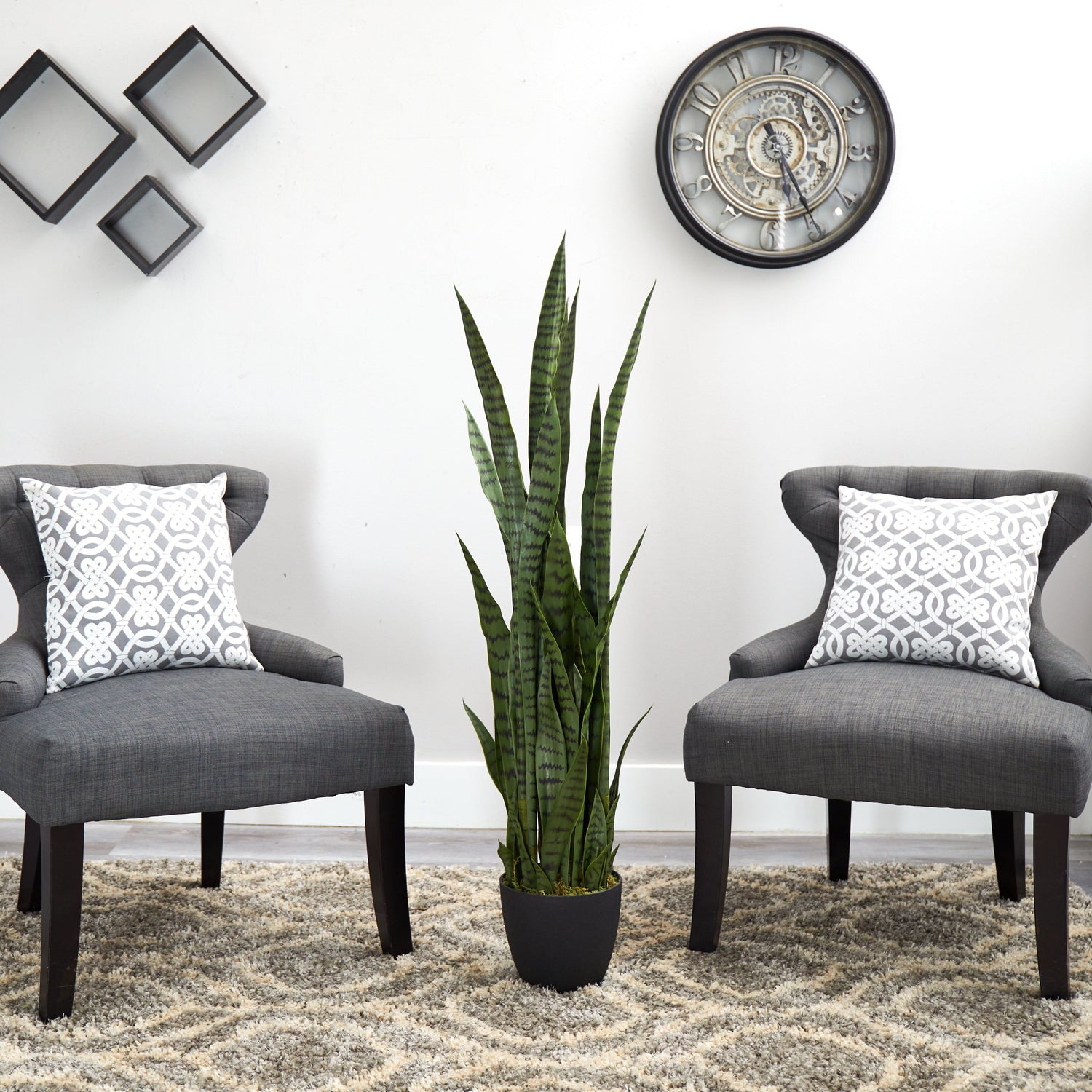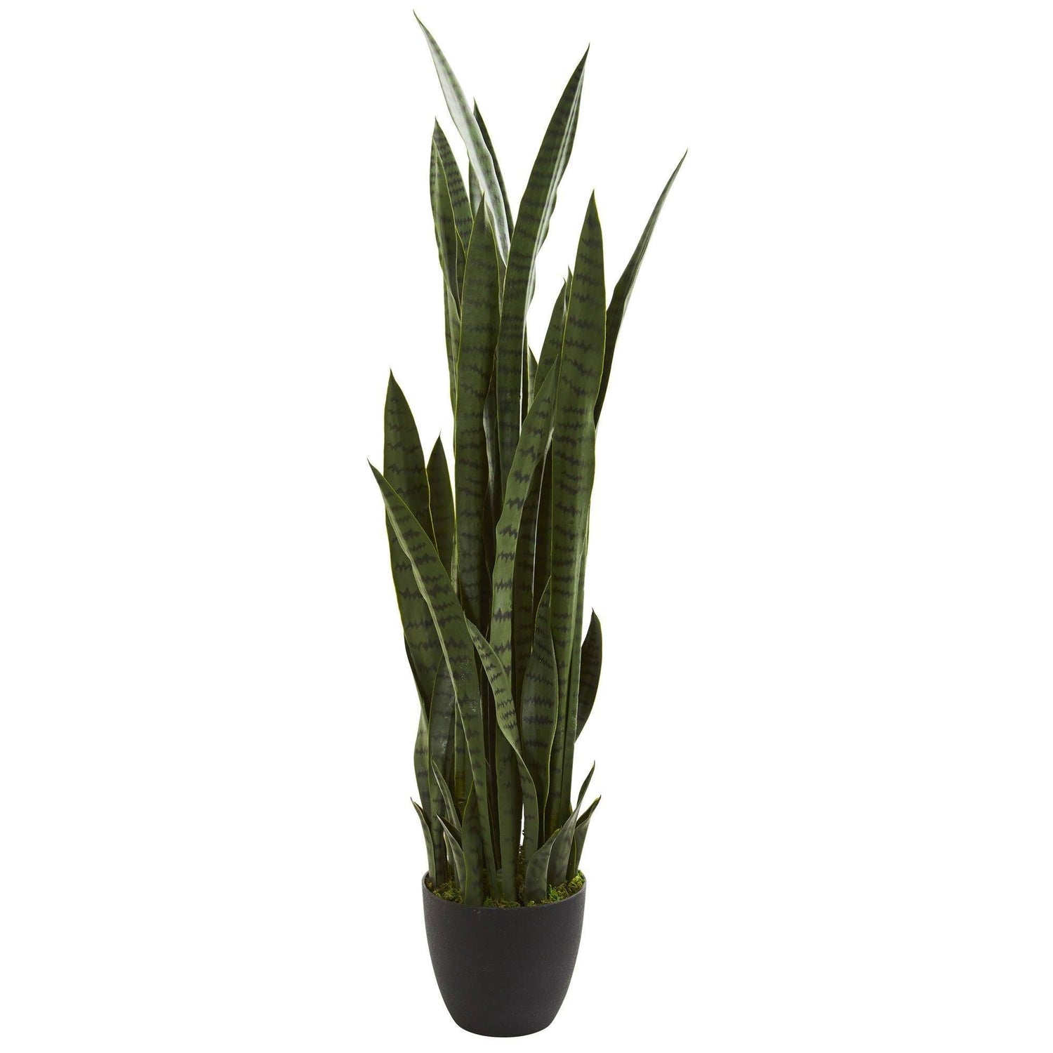 The 46 inch artificial sansevieria has long, straight-edged foliage that stands at various heights. The black stripes accenting each leaf amplify its realistic appearance. With its earth-toned coloring, it will make an excellent addition to any muted space like an office, study, or den. It will also look lovely on your sunroom's console table accented with a colorful doily underneath.