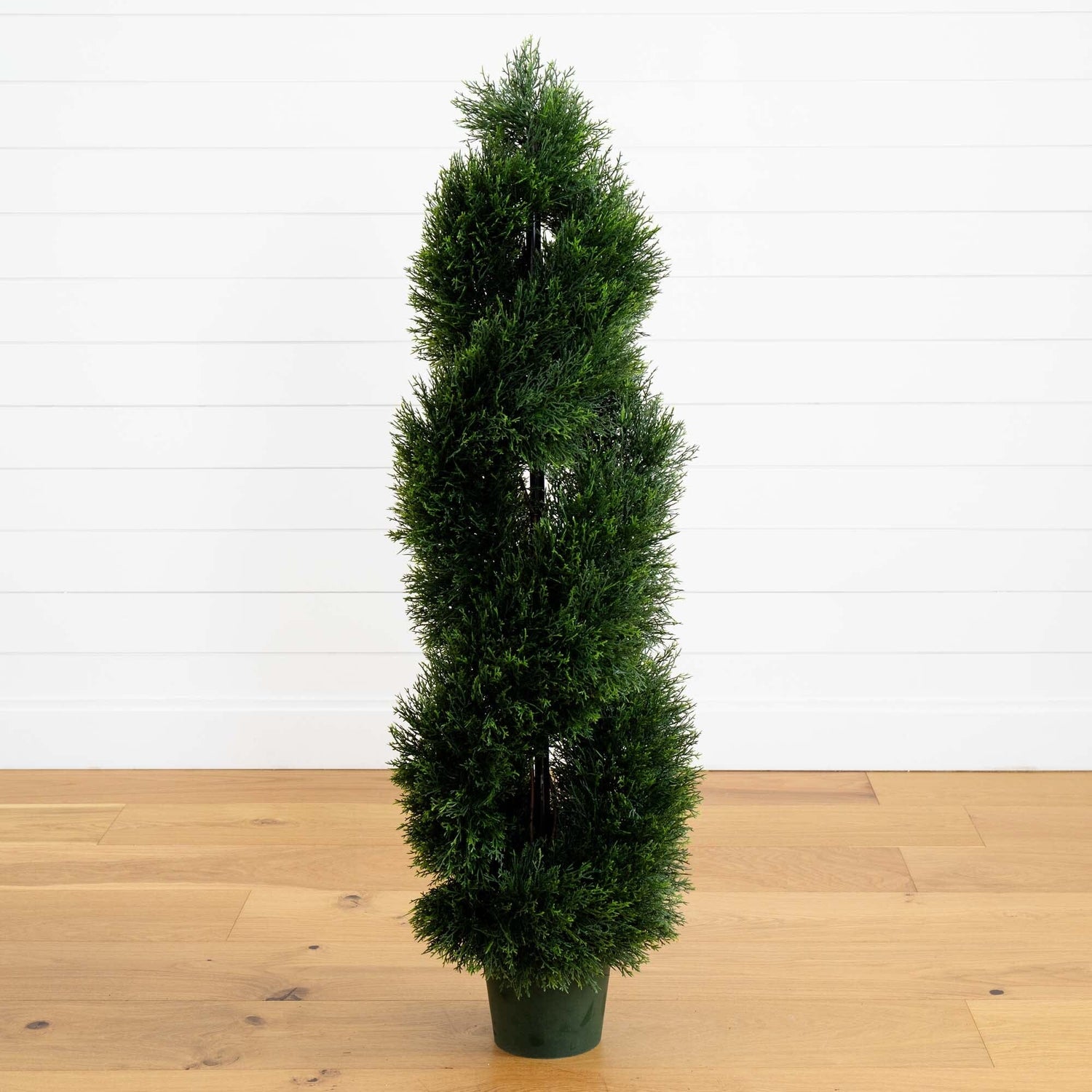 Standing 4 feet tall, this faux Double Pond Cypress plant features two twisting stalks of greenery to form a spiral topiary arrangement. Adorned with 1,036 leaves, this floor plant is handcrafted in fine detail to mimic a true topiary. Place at the front entryway to greet guests or atop an entryway table for added height. Leaves are UV Resistant, suitable for indoor or outdoor use.