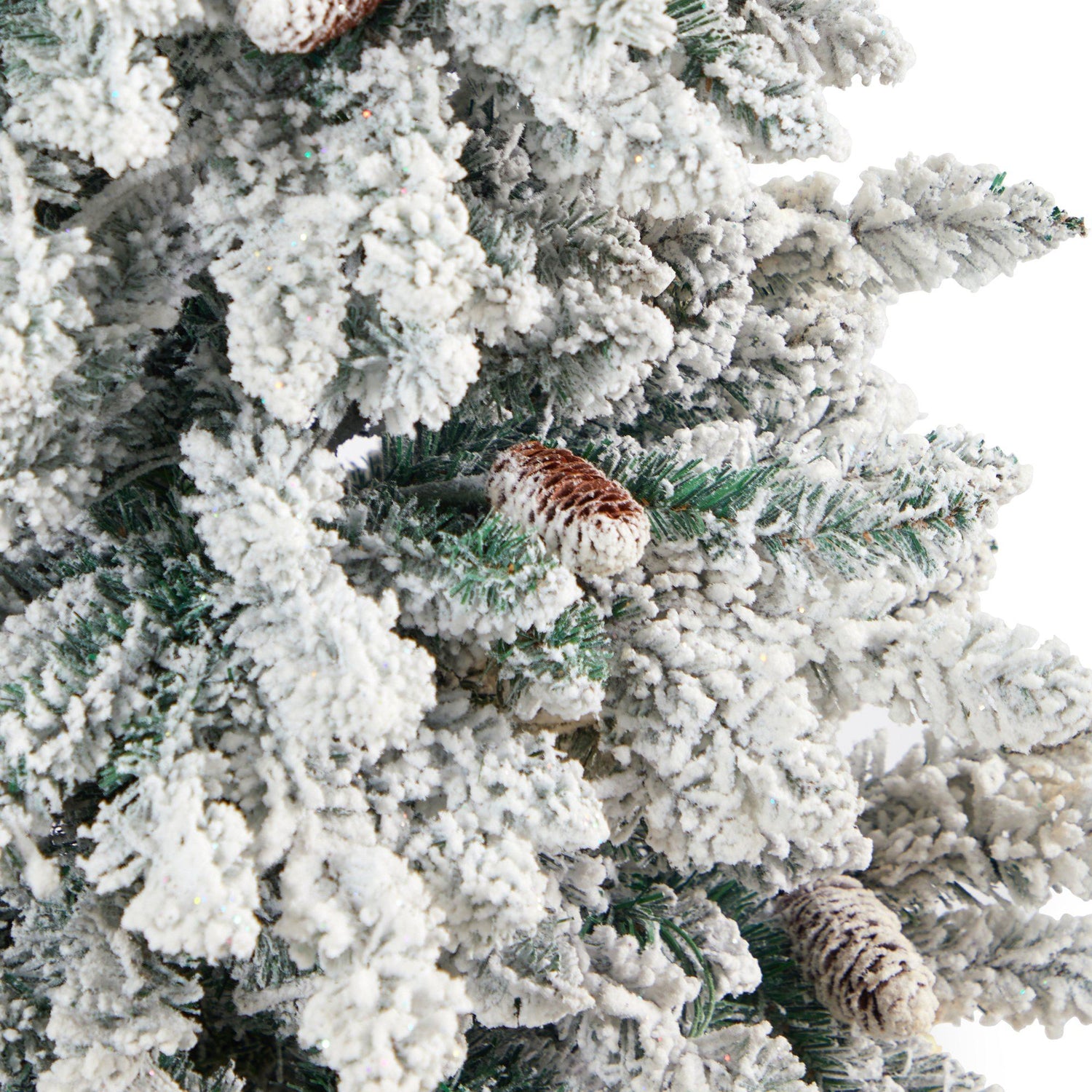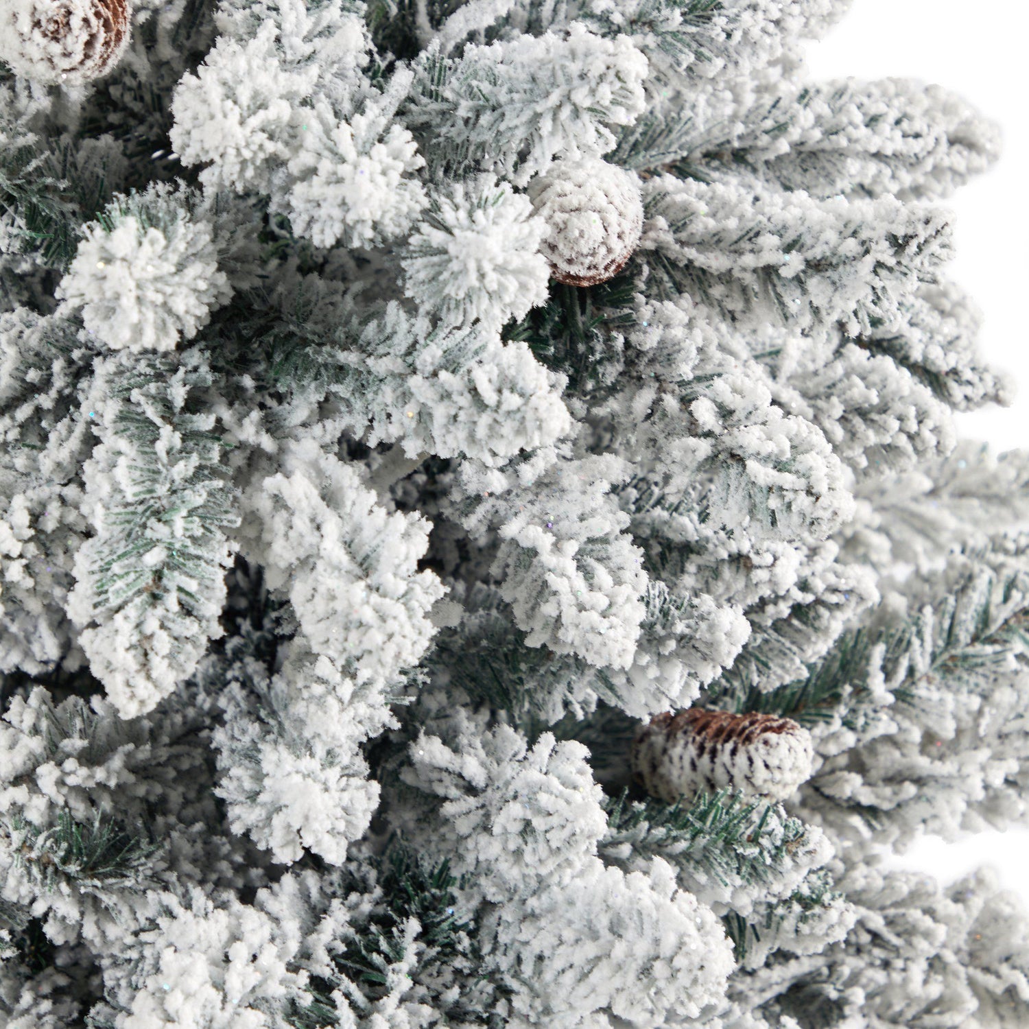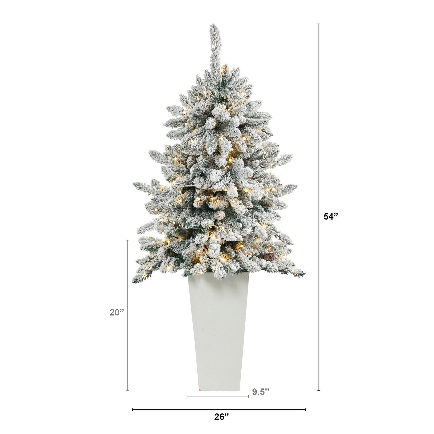 Transform your home into an enchanting winter wonderland with this flocked Livingston Fir Artificial Christmas Tree. If you dream of a white Christmas, these artificial trees are designed to mimic the texture and foliage of real trees with their upward sloping branches that can easily house mini ornaments. Adorned with pinecones throughout and pre-strung with 150 clear warm LED lights for a warm, candle-like glow, all that’s missing are your ornaments. Standing at 4.5’ from a tall planter (included in height), this flocked tree complements compact spaces that need some Xmas love. Everyone can have a white Xmas even if you live in the tropics.
