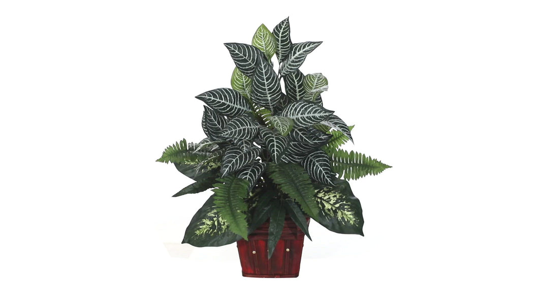 Spice up your décor anytime of the year with this luminous mix of greens. The distinctive color pattern of the zebra stripes immediately commands your eye’s attention, and the differing shapes add to this arrangement’s unique appeal. At 26” tall, this plant makes the perfect addition to any home or office setting. A beautiful wicker basket makes this plant stand out even further.